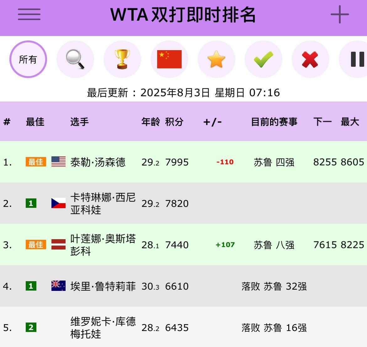 张帅汤森德组合延续连胜步伐,为汤森德世界第一续命。 WTA1000蒙特利尔站刚刚结束了一场双打1/4决赛,赛会3号种子张帅/汤森德以6-2 6-0横扫蒋欣玗/詹皓晴,北美硬地赛季联手取得七连胜,率先晋级四强。 本场比赛张帅发挥出色,同伴汤森德则发挥欠佳。汤森德接发球不好,网前也不太好;不过还好关键有ACE。对手的表现则一言难尽,输在情理之中。 本场胜利为汤森德世界第一续命。 凭借着本场比赛的胜利,汤森德双打即时排名已超越西尼亚科娃暂时来到第一。但奥斯塔彭科紧追其后排在第3位,她还有机会超越汤森德排名世界第一,因为奥胖组合刚刚战胜了赛会头号种子保利尼/埃拉尼组合晋级到了八强,明天进行1/4决赛。 而汤森德的老搭档西尼亚科娃近期专注单打,她刚刚拿到了一个125K冠军。这是华沙125K冠军,西尼亚科娃6-1 6-2戈卢比奇,拿到125分15500美金,单打排名上升16位来到73位。 张帅,好人啊[呲牙][赞] #头号创作者激励计划#