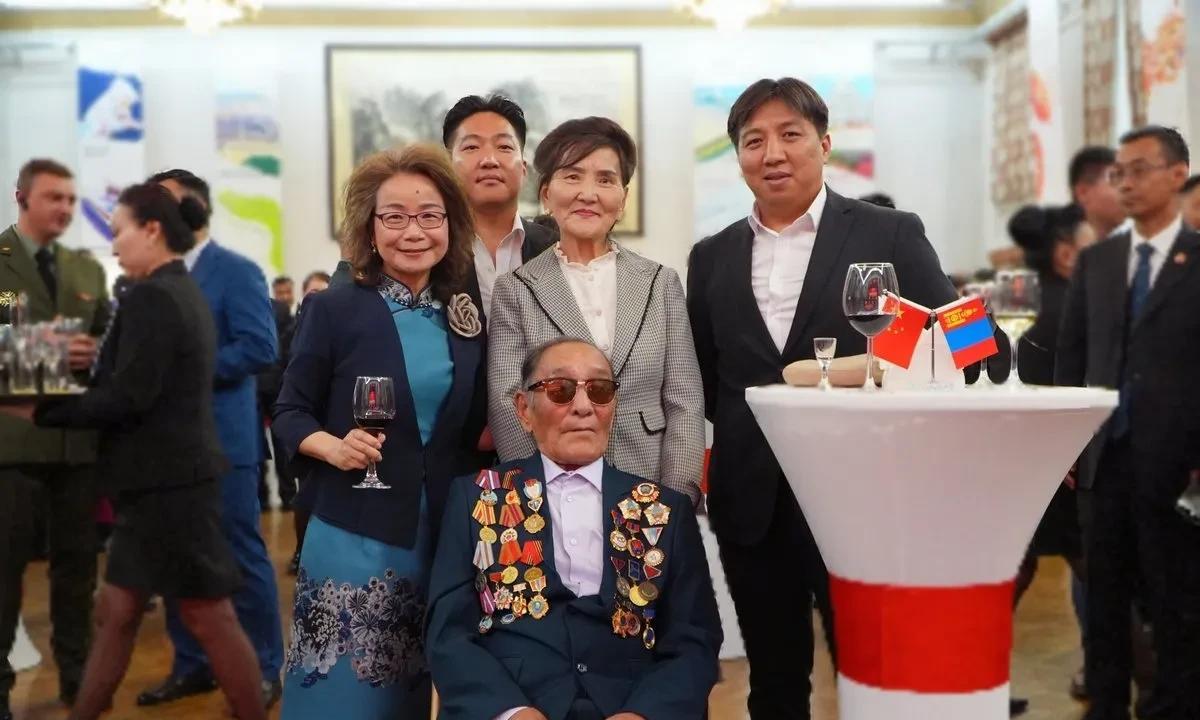 中国大使敬酒蒙古老兵。在抗战胜利80周年之际,中国驻蒙古大使馆举行庆祝酒会,邀请百岁蒙古老兵沙加达尔及其家人参加活动。中国大使向其敬酒,表达谢意。