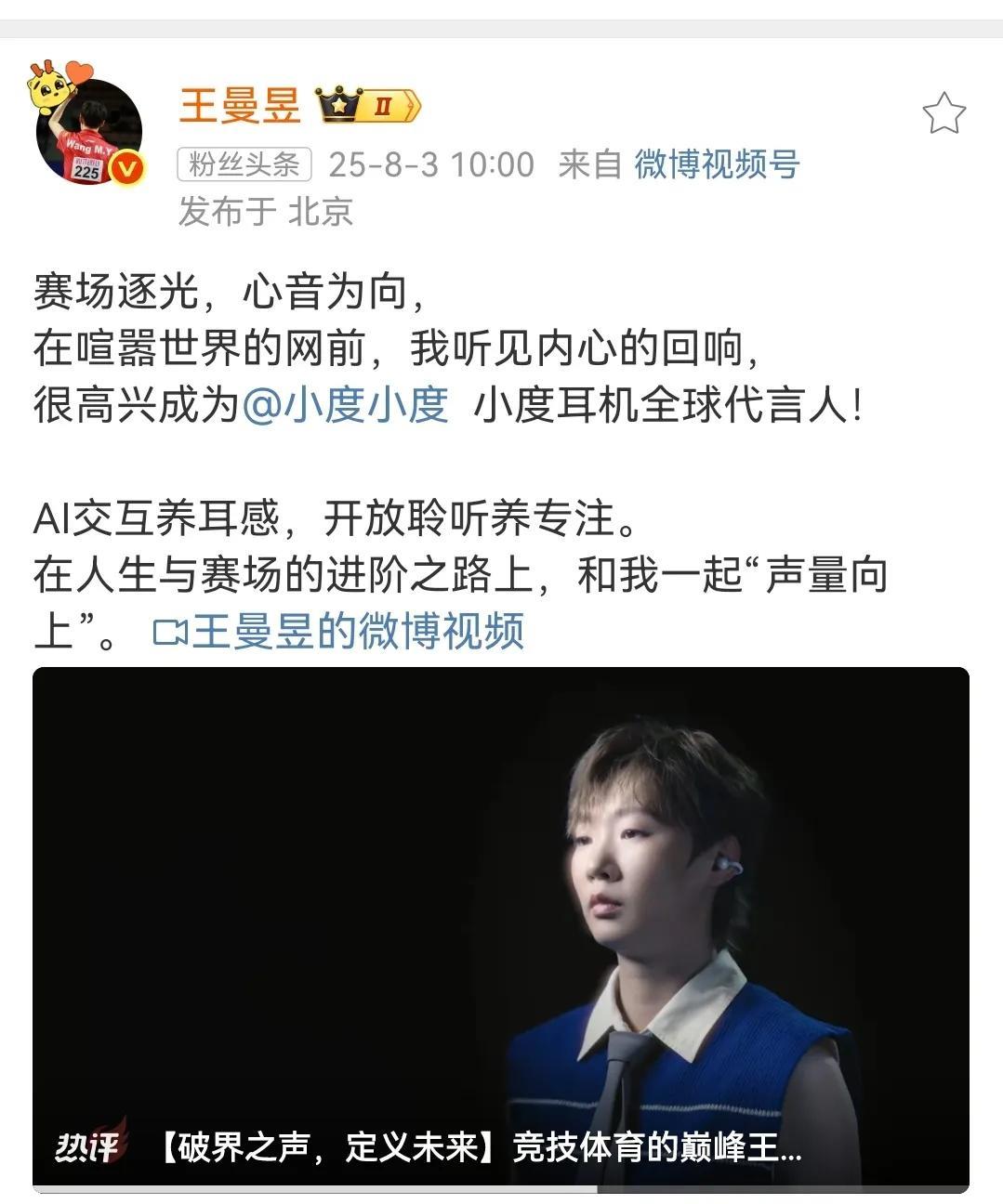 王曼昱的造型师真的很懂曼昱,她知道如何展现王曼昱赛场外最美的一面。 我曾经说过王曼昱如果有一天离开球台了,时尚圈可以是她的下一站,王曼昱拥有高高瘦瘦的身材,这样的身材就是天生的衣架子,而且王曼昱的短发,随便抓几下,就是一个酷酷的发型。 今天曼昱代言的小度耳机,连台词我都很喜欢,可以说这就是为曼昱量身打造的广告词,非常自然的和运动员融合在一起。 万众(是我加的)瞩目之下 我捕捉那一声微响 毫厘之间是精准的博弈 专注是每一时刻的本能 每一次挥拍 让内心和耳畔的声音合拍 当压力来袭,光芒在肩 只留清晰入耳 听见自己内心的声音 捕捉每个音符的震颤 沉入曼妙的天音秘境 压力,终成脚下的阶梯 在接阶之路上 让美好的声音,触手可及。 #晒图笔记大赛#