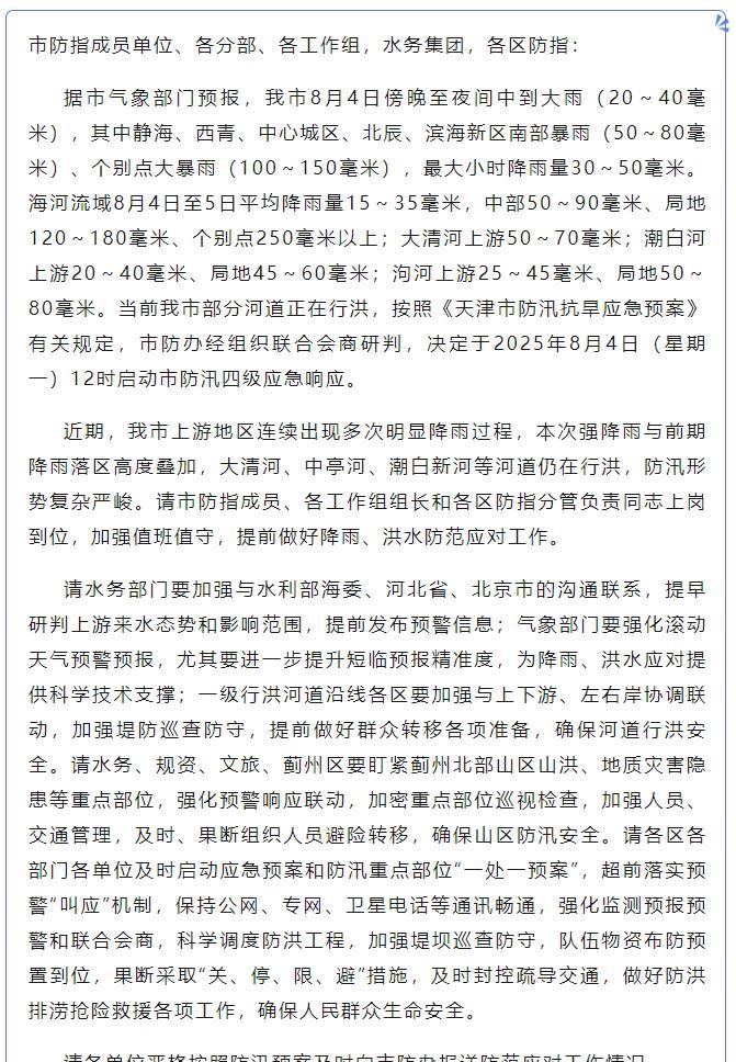 【#天津#市防办:启动市防汛四级应急响应】按照《天津市防汛抗旱应急预案》有关规定,市防办经组织联合会商研判,决定于2025年8月4日(星期一)12时启动市防汛四级应急响应。
