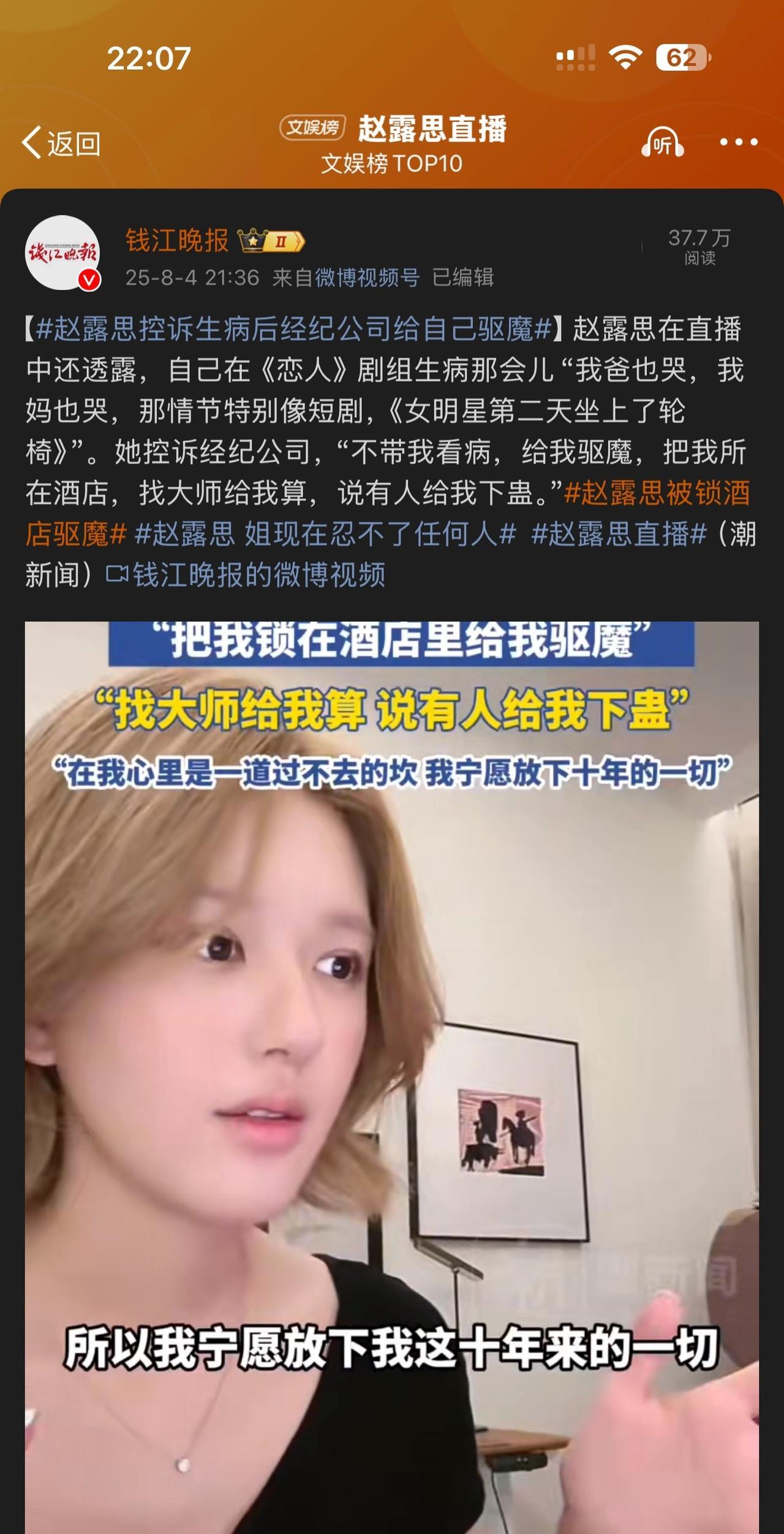赵露思自曝曾被关在酒店驱魔,大师还说她被人下蛊了,这画风不对呀,感觉一下子就从科技文明穿越到了玄幻文明。刚刚刷新闻一不小心刷到《黔江晚报》的一条视频消息,大概拍摄的是赵露思自曝其生病后经纪公司不带她去看病,然而找大师算命驱魔,更玄幻的是说她被人下蛊了。这都什么年代了,建国都70多年了,早就不允许成精了。下蛊、驱魔这些活动居然还有人信啊,连信哥们儿都敢破戒养私生子了。我记得小时候农村小孩儿生病后都是先去看医生,不见好转或者效果不明显才回去信那些神秘力量,这到现在怎么给弄反了?如果她说的是真的,那就太可怕了。这下球踢给经纪公司了,看看怎么回应吧! #头号创作者激励计划#