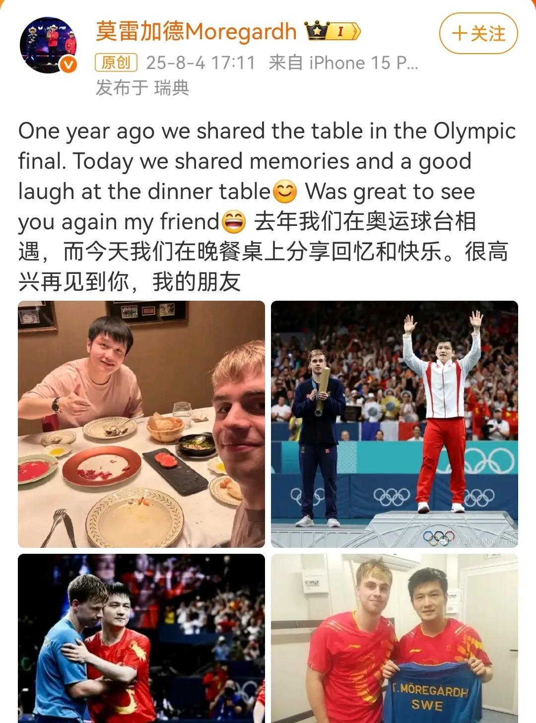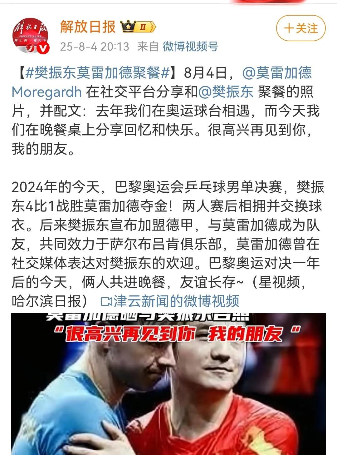 赛场上他们是对手,赛场下他们是朋友,赢了比赛,也赢了尊重,樊振东的实力和人格魅力一样得到对手认可。 巴黎奥运会男单决赛一周年之际,瑞典名将莫雷加德,巴黎奥运男单亚军莫雷加德在个人社交平台晒出和樊振东共进晚餐的画面,共享回忆和快乐。 巴黎奥运对于樊振东来说最难忘的是四分之一决赛对阵日本选手张本智和的那一场比赛,巴黎奥运会的比赛结果对于樊振东的乒乓球运动员职业生涯来说是完美的,至巴黎奥运会拿下男子单打冠军的樊振东已经实现了职业生涯的超级全满贯,就是一名乒乓球职业运动员,所有该拿的冠军,樊振东全部都拿过了。 现在的樊振东已经加盟德国萨尔布吕肯俱乐部,属于德国甲级联赛的一个俱乐部,这家俱乐部除了拥有中国名将樊振东,也有很多其它国家的知名球员,莫雷加德、邱党、弗朗西斯卡等。 祝福小胖在德国开心打球!快乐打球!打出更多好球!小胖加油! #晒图笔记大赛#