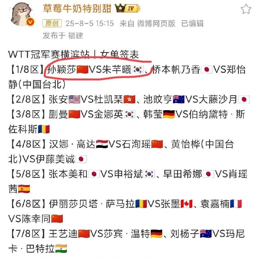 小豆包跑快点,电梯门又要关上啦,急的你头哥都回头瞅了“这性子除了打球,干啥都磨磨唧唧”[泪奔] 都顺利到达酒店休息了,抽签好像是迪哥和谁去的,这签位一出,估计又开始吵谁上上签,谁下下签了[呲牙] 不过你们签再不好,也没这4位残惨吧?板上钉钉的他们会是一轮游[泪奔]先同情他们3秒钟, (林昀儒和陈垣宇,朱芊曦和迪亚兹)那没办法,谁让他们运气差了一点,上来就对男女世一世二[笑哭] 有人说“楚钦老师的半区基本又是打了一次奥运,小布,小莫又要逐个打打一遍…” 那高端局打来打去不都是老对手嘛! 还有说“王曼昱坐镇下半区,但签运可谓下下签,和陈熠、王艺迪同处4/4区,这意味着三位国乒主力中仅有1人能够晋级半决赛” 那没看孙颖莎镇守的上半区,不也有蒯曼,石洵瑶嘛!晋级路上还有日本削球名将桥本帆乃香,韩国金娜英,日本伊藤美诚呢[抠鼻]