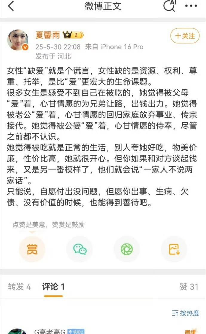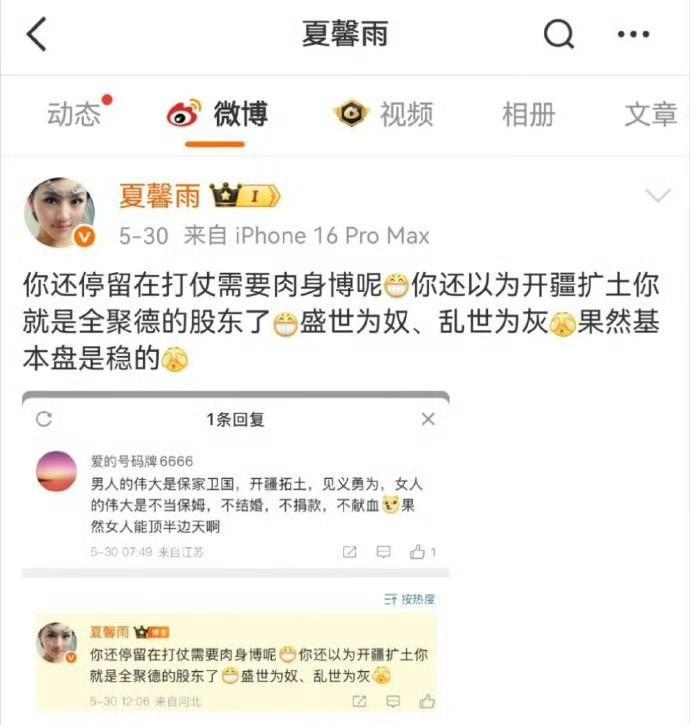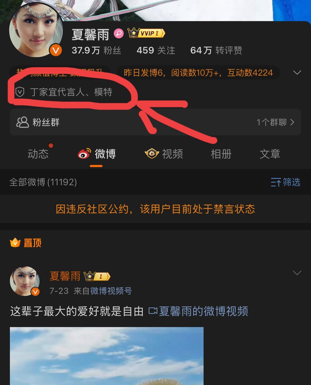 十八线小艺人夏馨雨这次终于翻车了,估计过不了多久就会凉凉。前两天围脖侠才发布了关于整治一些阴阳怪气攻击诸如《南京照相馆》等爱国电影账号的通告,但这家伙一点都没放在心上依然暗戳戳的搞事情。这家伙其实是惯犯了,不只有这次才这样,之前已经有过多次类似前科。现在才处理她已经是手下留情了,况且其认证是是某某品牌代言人,但这个品牌早前已经发布过通告和他撇清了关系,但现在其认证都还未撤销,有点让人想不通。对这样这种人只是禁言是不够的,强烈建议直接封号。 #头号创作者激励计划#