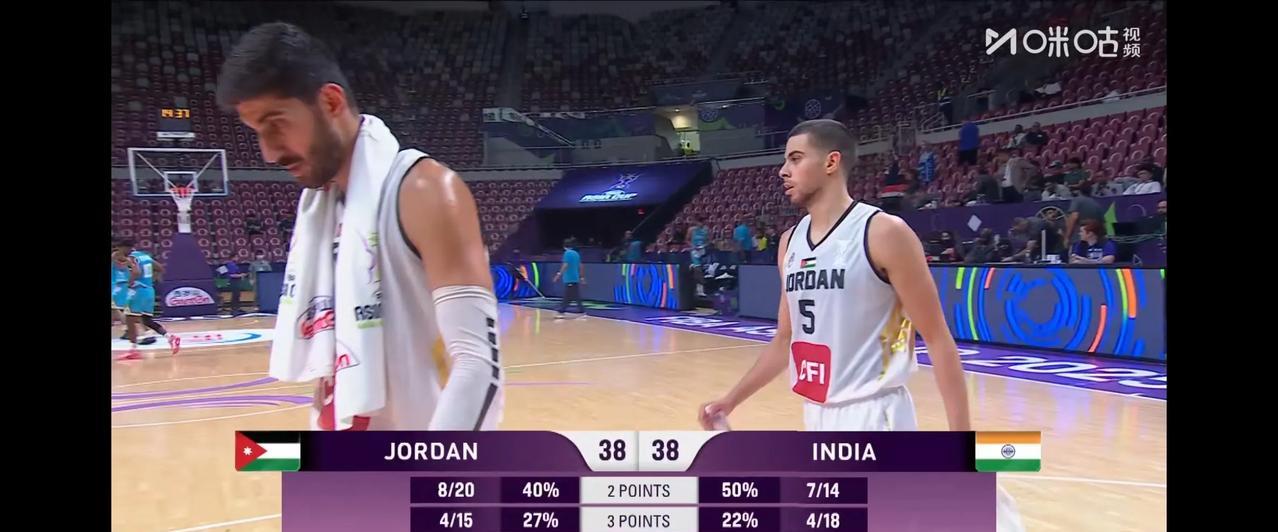 中国男篮小组第一晋级八强稳了! 爆冷:弱旅印度半场38:38逼平约旦! 菜鸟互啄,约旦队在菜鸟印度队面前何无办法,首节比赛双方的投篮命中率33%:33%,三分球命中率25%:23%,罚球命中率33%:100%。 半场结束,双方打出38:38的超低比分。篮板球24:25,助攻6:7,失误5:9,约旦队毫无优势可言,仅依靠归化老将塔克一人独得18分咬住与印度队比分。