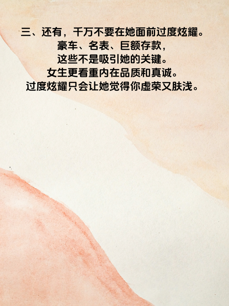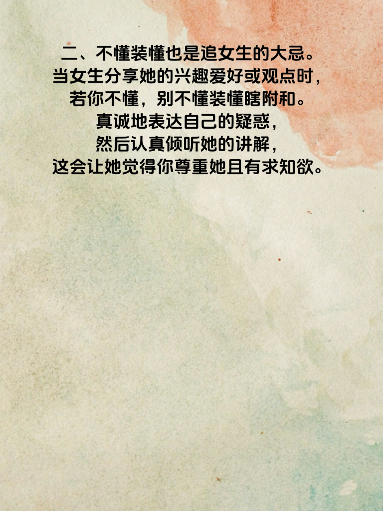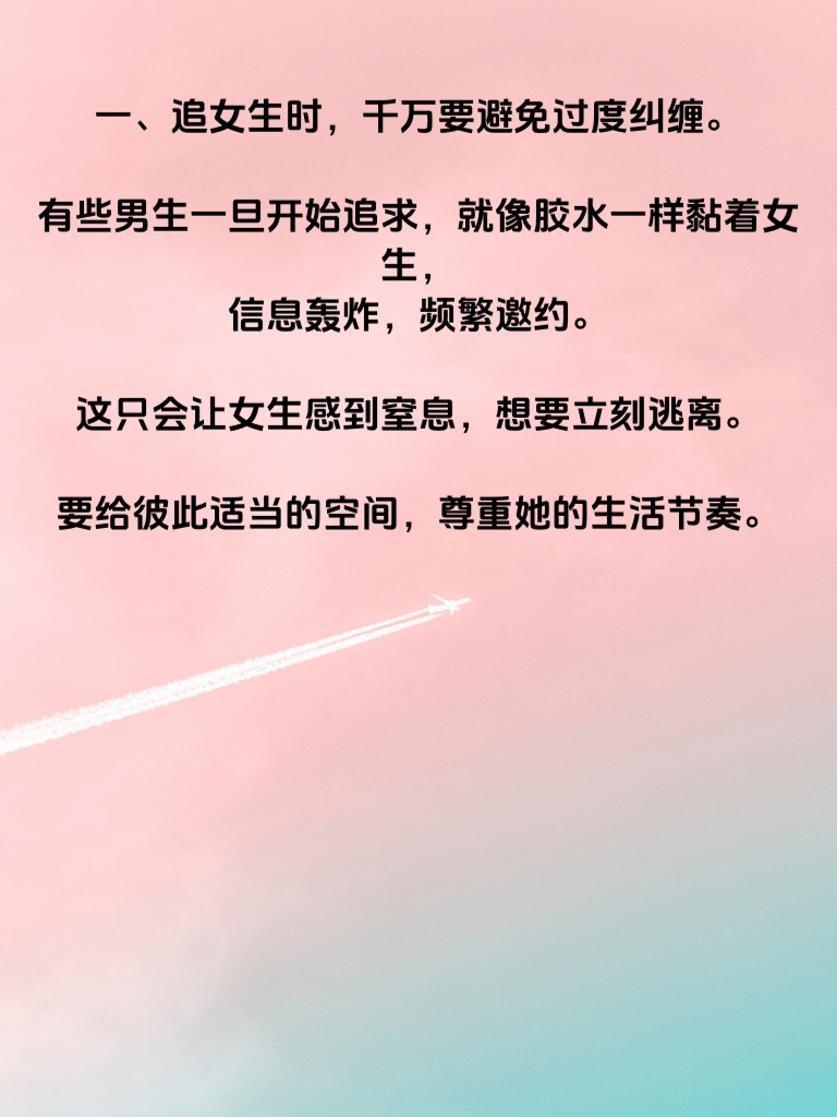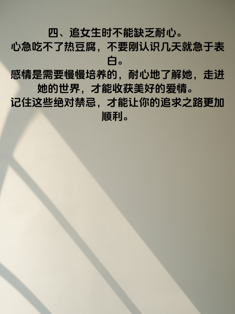 一、追女生时,千万要避免过度纠缠。有些男生一旦开始追求,就像胶水一样黏着女生,信息轰炸,频繁邀约。这只会让女生感到窒息,想要立刻逃离。要给彼此适当的空间,尊重她的生活节奏。 二、不懂装懂也是追女生的大忌。当女生分享她的兴趣爱好或观点时,若你不懂,别不懂装懂瞎附和。真诚地表达自己的疑惑,然后认真倾听她的讲解,这会让她觉得你尊重她且有求知欲。 三、还有,千万不要在她面前过度炫耀。豪车、名表、巨额存款,这些不是吸引她的关键。女生更看重内在品质和真诚。过度炫耀只会让她觉得你虚荣又肤浅。 四、追女生时不能缺乏耐心。心急吃不了热豆腐,不要刚认识几天就急于表白。感情是需要慢慢培养的,耐心地了解她,走进她的世界,才能收获美好的爱情。记住这些绝对禁忌,才能让你的追求之路更加顺利。