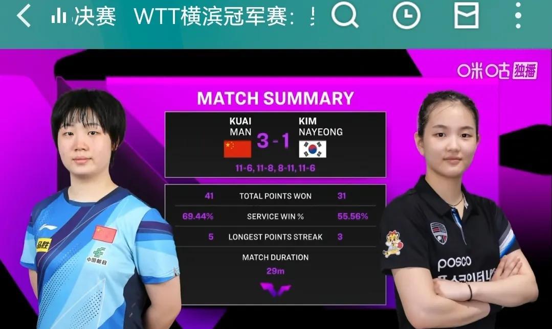 恭喜我们盐城射阳女孩蒯曼在横滨冠军赛首轮3:1战胜韩国选手金娜英,恭喜蒯曼为中国队带来开门红红,恭喜蒯曼率先晋级女单16强。 横滨冠军赛北京时间今天上午9:00准时开始,中国队蒯曼对阵韩国队金娜英,第一局11:6蒯曼率先拿下,第二局11:8蒯曼再拿一局。 第三局金娜英也开启了疯狂的搏杀模式,蒯曼虽然落后也没有放弃追分6:10,蒯曼落后也努力追分至8:11金娜英扳回一局。 第四局蒯曼没有再给金娜英太多机会11:6蒯曼拿下,大比分3:1蒯曼晋级女单16强,也为中国乒乓球队横滨冠军赛带来开门红!恭喜中国移队!恭喜蒯曼! #记录我的2025#