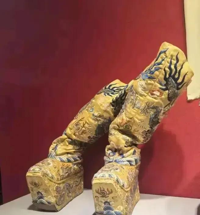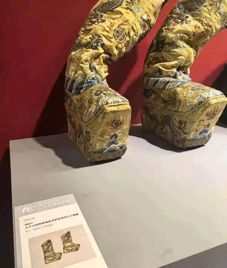 这是博物馆珍藏的太平天国领袖洪秀全专用靴子,这靴子装饰华丽,如同一件艺术品,一看就是价值不菲。但是有一点不明白的是,这鞋底如何这么高,与上世纪九十年代妇女穿的松糕鞋有一比。这么高的鞋底,男人穿上它确实非常不般配,感觉扭扭捏捏的。穿上这双鞋走路稳吗?怪不得电视里的皇上,娘娘走路扶着人,一不小心就摔倒。看来作为农民起义领袖的洪秀全自从做了皇帝以后,一切都变了。