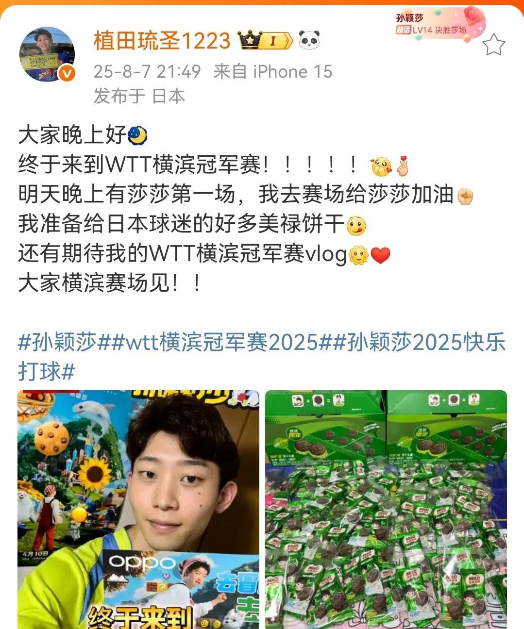孙颖莎的日本球迷真的很贴心,这位叫植田琉圣的年轻人,五年前因为喜欢莎莎打球,所以在大学里特意学习中文。 他不仅到现场支持莎莎,给莎莎加油!还买了很多莎莎代言的美禄饼干,今天晚上带到现场和日本支持莎莎的球迷一起分享。 这位-植田琉圣的男孩子中文学的也不错,也注册了中文的社交媒体App,在里面分享他的球迷日常。 莎莎的球迷很给力,也很理性,莎莎就是一道光,她的球迷也很努力,很上进。 #晒图笔记大赛#
