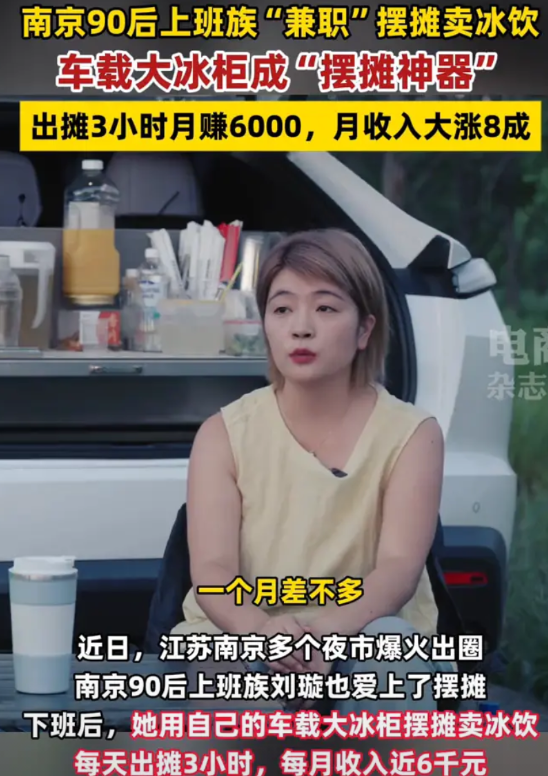 南京90后上班族"兼职"摆摊卖冰饮,车载大冰柜成"摆摊神器"。 出摊3小时月赚6000,月收入大涨8成。 刘璇:每天大概两三百块钱,好的接近四百,一个月差不多有五六千块钱。摆摊肯定是自由一点,主要业余时间做也比较轻松。摆摊做饮料冰块是最难解决的问题。 刘璇:这个车有个冰箱,特别大的冰箱五十二升,可以冷冻也可以冷藏,比较好保存,很方便。 近日,江苏南京多个夜市爆火出圈,南京90后上班族刘璇也爱上了摆摊,下班后,她用自己的车载大冰柜摆摊卖冰饮,每天出摊3小时,每月收入近6千元。 刘璇是一名新媒体策划,工作朝九晚六,每月工资8千左右。最近两个月靠着摆夜摊,累计赚了上万元,月收入直接涨了80%。"比起早九晚六的上班,摆摊时间更自由"。刘璇在夜市摆摊卖的是夏季冰饮,售价在15-18元不等,1天最多能卖50杯,卖的最好是一款西瓜冰椰的饮品。每天出门摆摊前,刘璇都要备好5斤西瓜、1800ml茶,放进车内后备箱。夏季天热,后备箱的车载大冰箱,完美解决了制冷储存等问题,还有超大空间可以装冰块等物品。 因为天气炎热,对冰饮的需求本来就大,再加上刘璇摆摊位置选在一家烧烤摊边上,很快,她卖的鲜榨果汁等冷饮热销整个夜市。