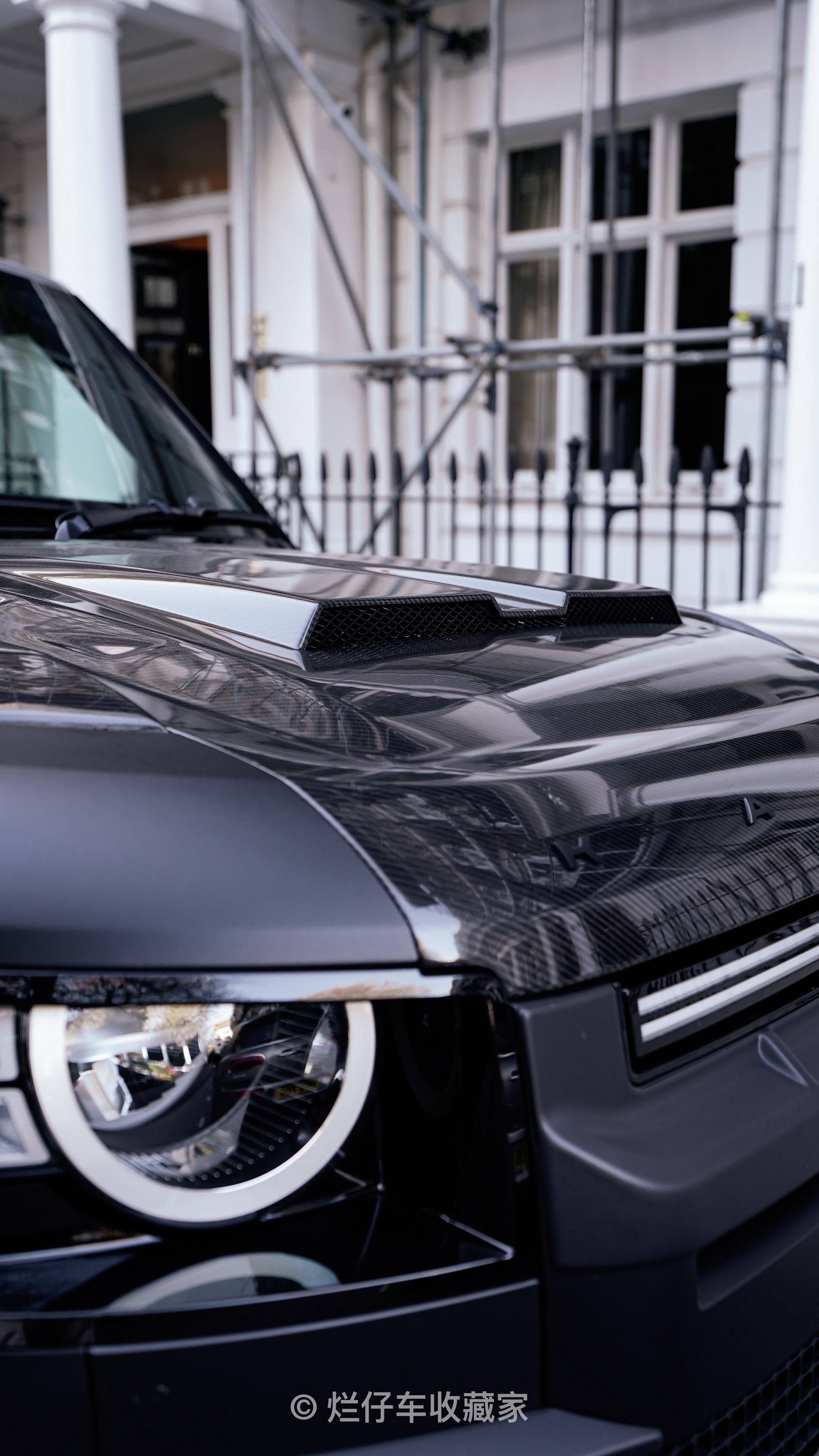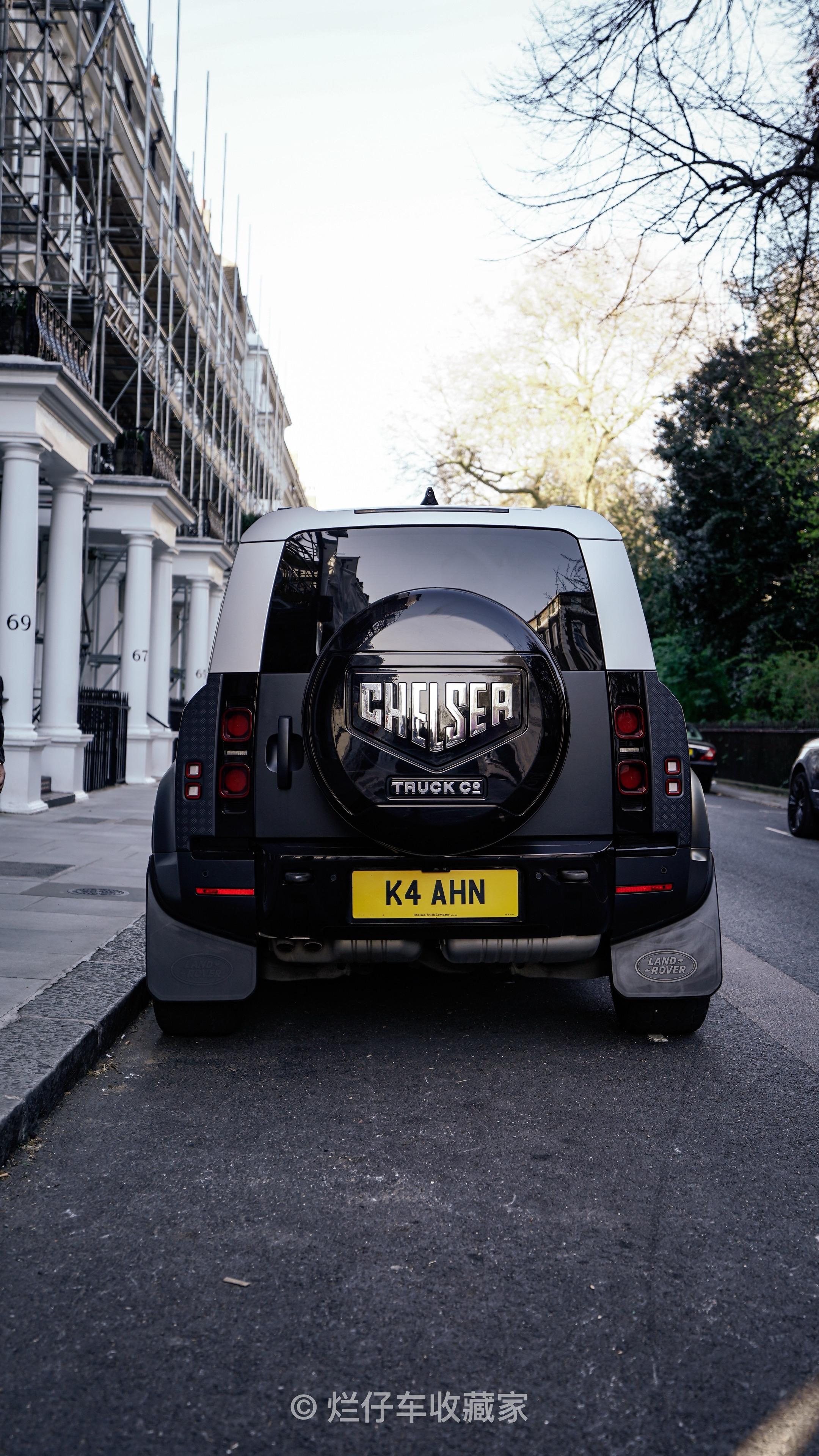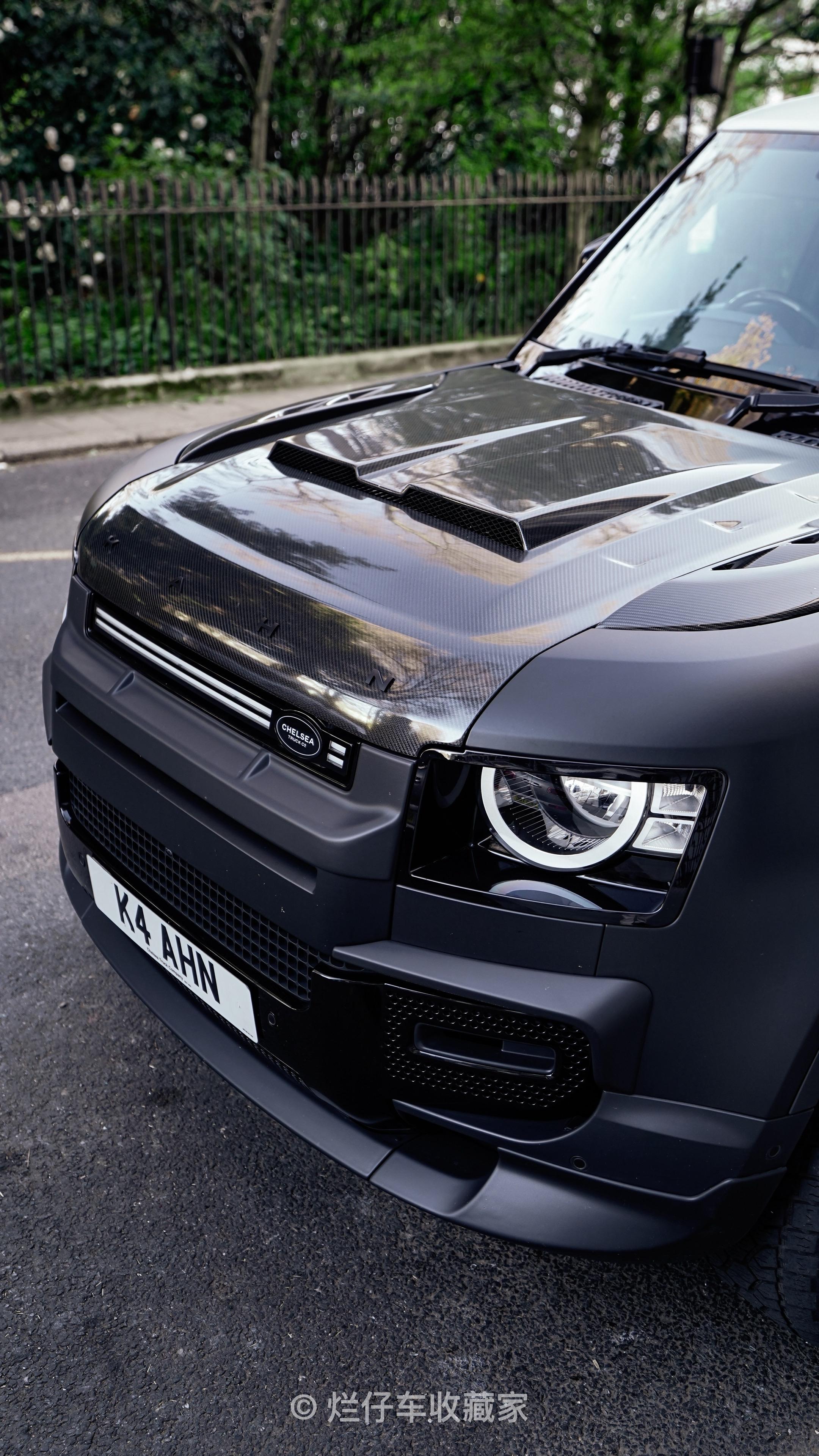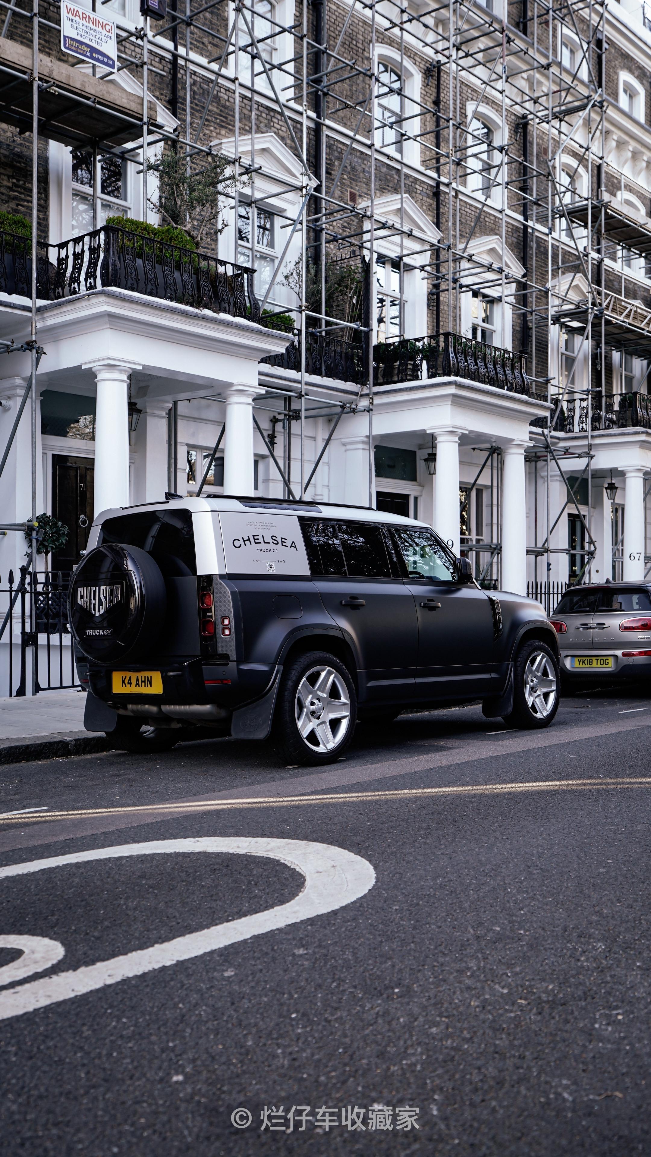 🇬🇧伦敦切尔西老钱区的路虎卫士。双拼色,隆起打孔碳纤维机盖,五星轮...