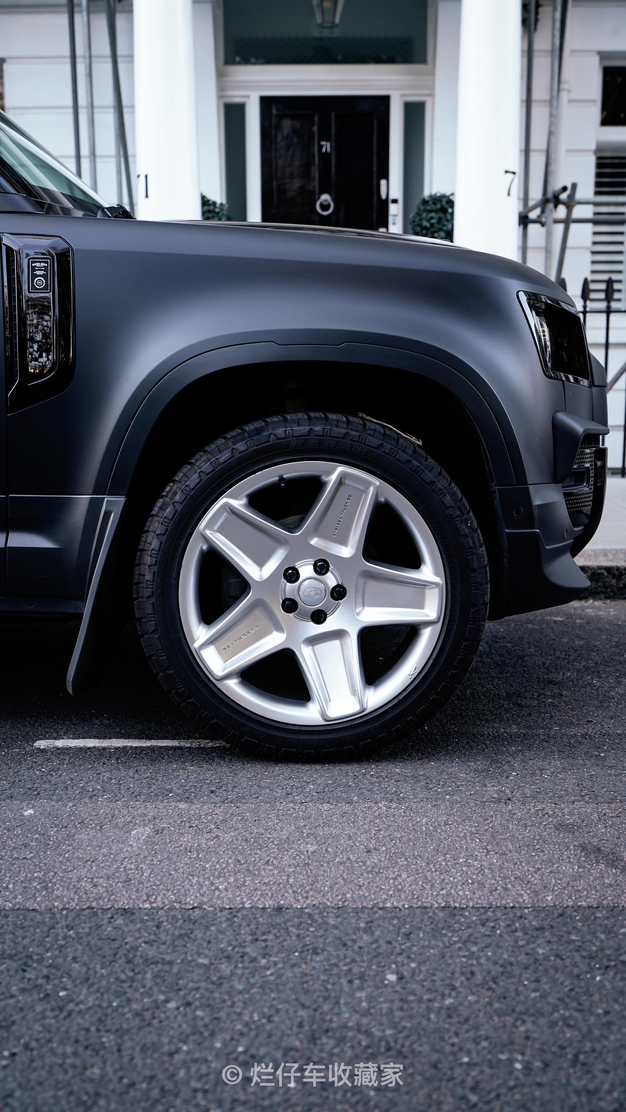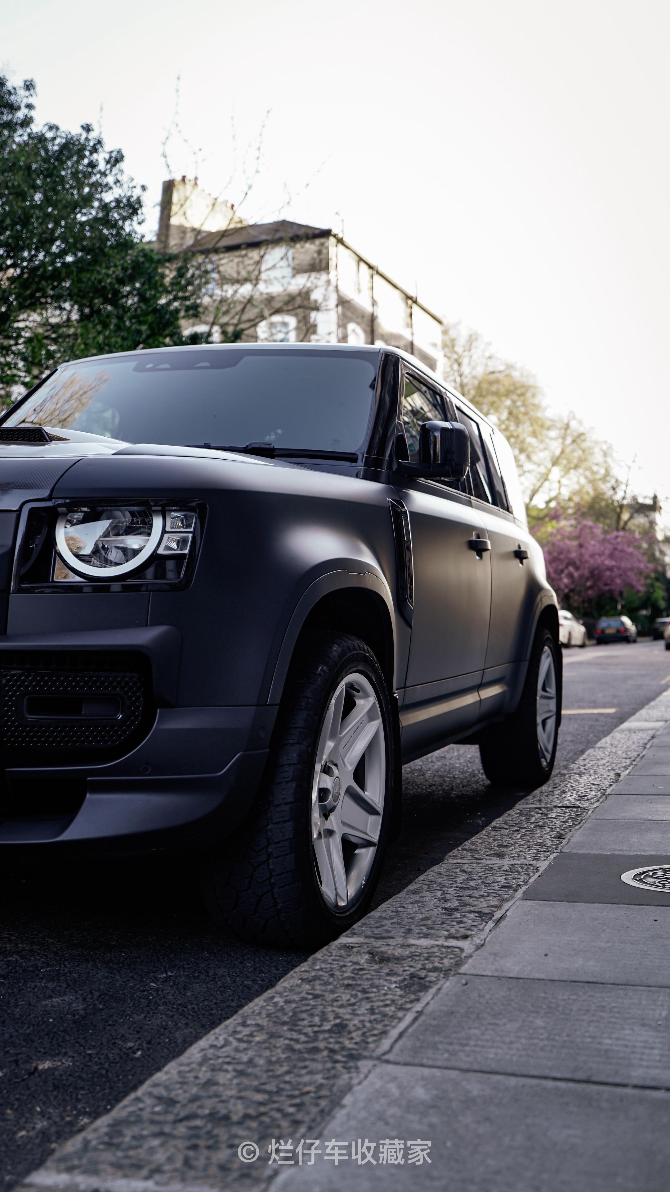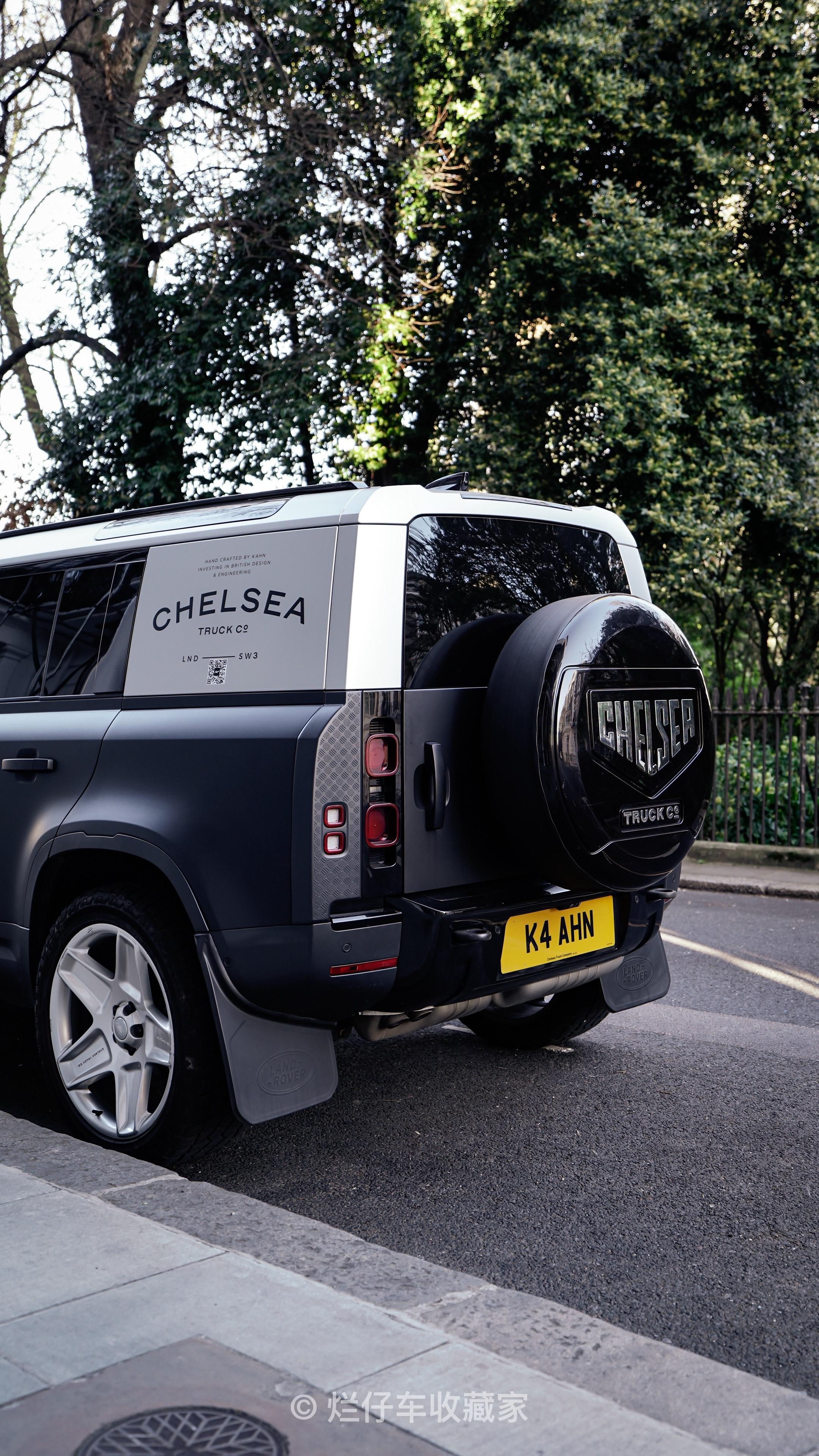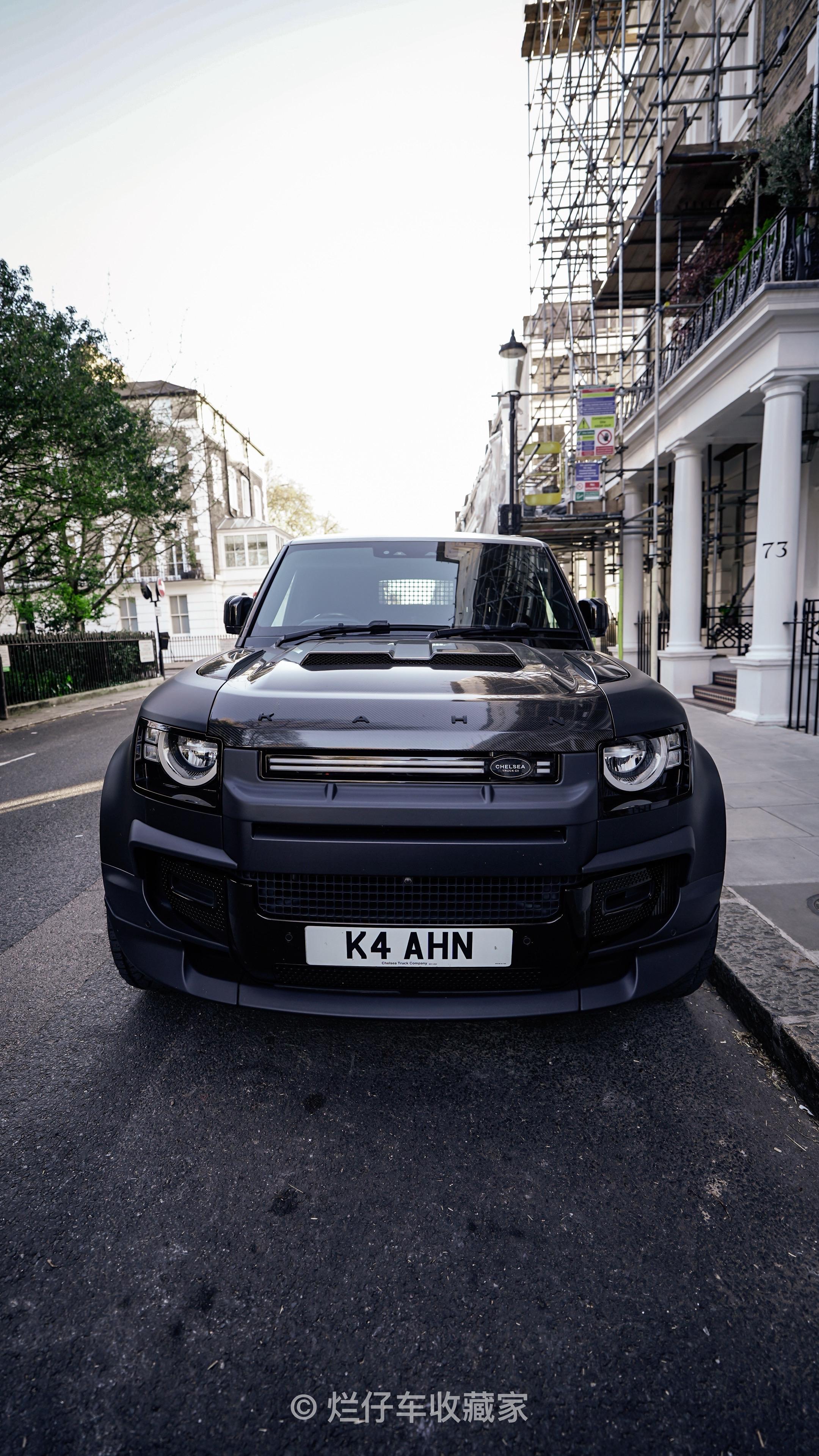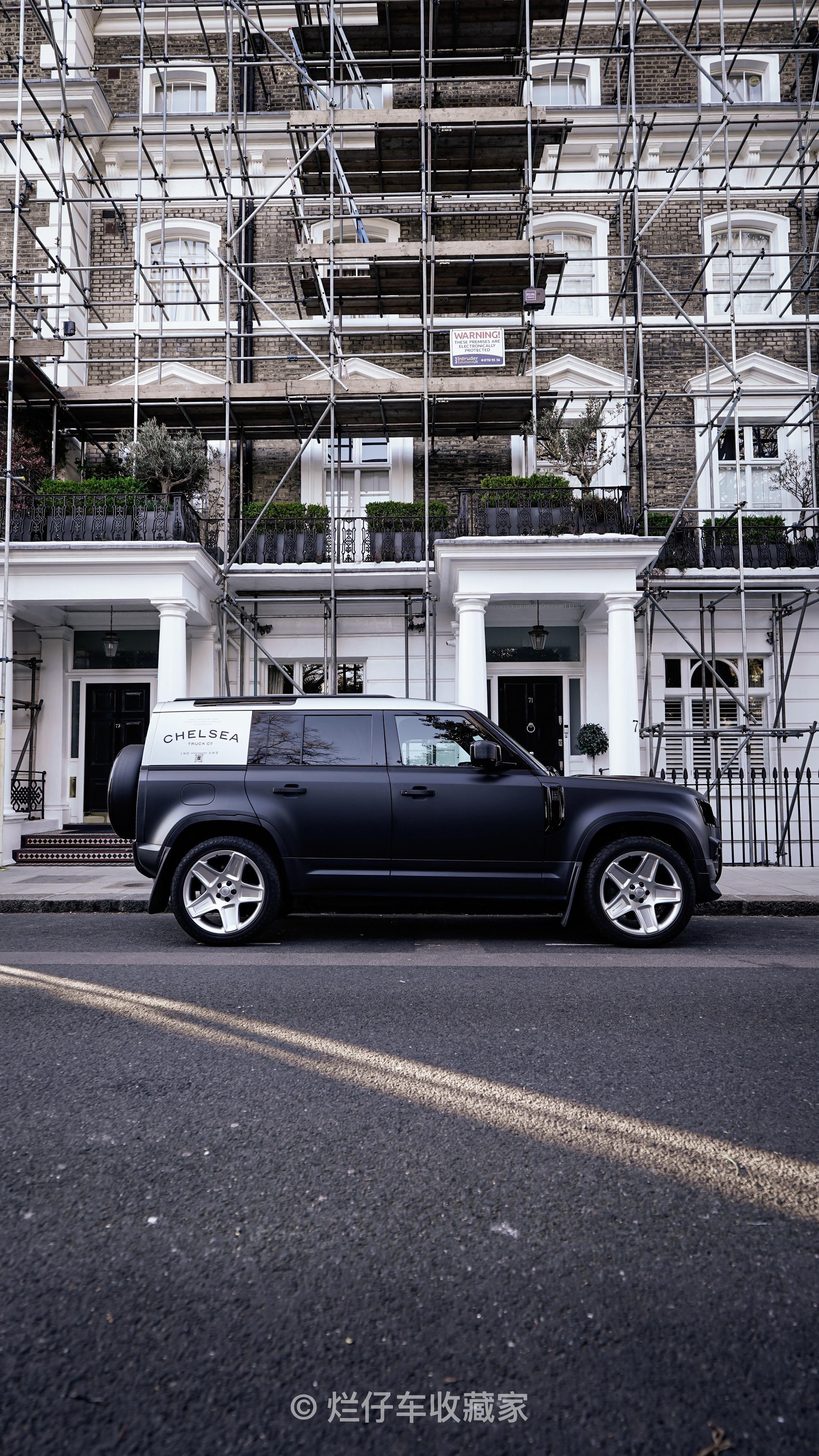 🇬🇧伦敦切尔西老钱区的路虎卫士。双拼色,隆起打孔碳纤维机盖,五星轮...