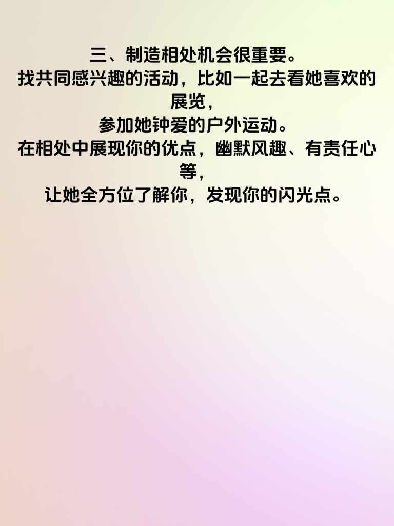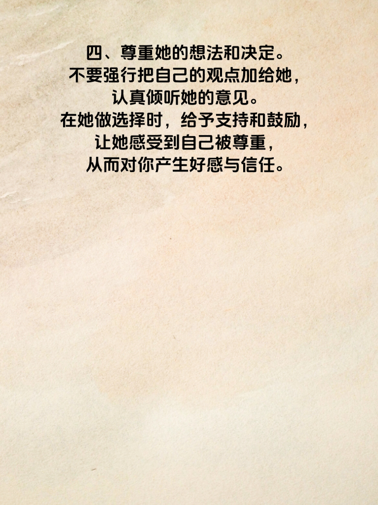 一、了解心仪女生是关键。花时间去观察她的喜好、兴趣,是喜欢看电影、读书,还是热衷于户外运动。知晓她的生活节奏,她是早起型还是夜猫子。只有摸透这些,才能在后续相处中有的放矢,投其所好。 二、真诚是永远的必杀技。别玩虚的,真心对待她。从日常的关心问候开始,天冷提醒添衣,生病时送上温暖关怀。用真诚打动她,让她感受到你是实实在在在乎她,而不是一时兴起。 三、制造相处机会很重要。找共同感兴趣的活动,比如一起去看她喜欢的展览,参加她钟爱的户外运动。在相处中展现你的优点,幽默风趣、有责任心等,让她全方位了解你,发现你的闪光点。 四、尊重她的想法和决定。不要强行把自己的观点加给她,认真倾听她的意见。在她做选择时,给予支持和鼓励,让她感受到自己被尊重,从而对你产生好感与信任。 五、适时表白也不可少。当感觉彼此关系升温,时机成熟时,可以勇敢表白。用真诚且深情的话语,表达你对她的心意,给这段感情一个明确的开始。