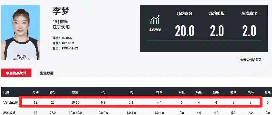 李梦用全能数据啪啪打脸刚腹自用的宫鲁鸣! 在刚刚结束的全运会预选赛对阵山西女篮的比赛中,李梦出场18分钟,两分球9投9中,三分球1投1中,罚球4中4,三项投篮命中率均为100%!拿下25分,另拿到4个篮板,5次助攻,正负值+52。 中国女篮最好的前锋状态仍然在线,防守端强悍,进攻端火力十足!亚洲杯前,宫鲁鸣对外宣称李梦长期缺席系统性训练,状态不达到国家队要求,拒绝李梦进入国家队。 这样状态都达不到国家队的要求吗?