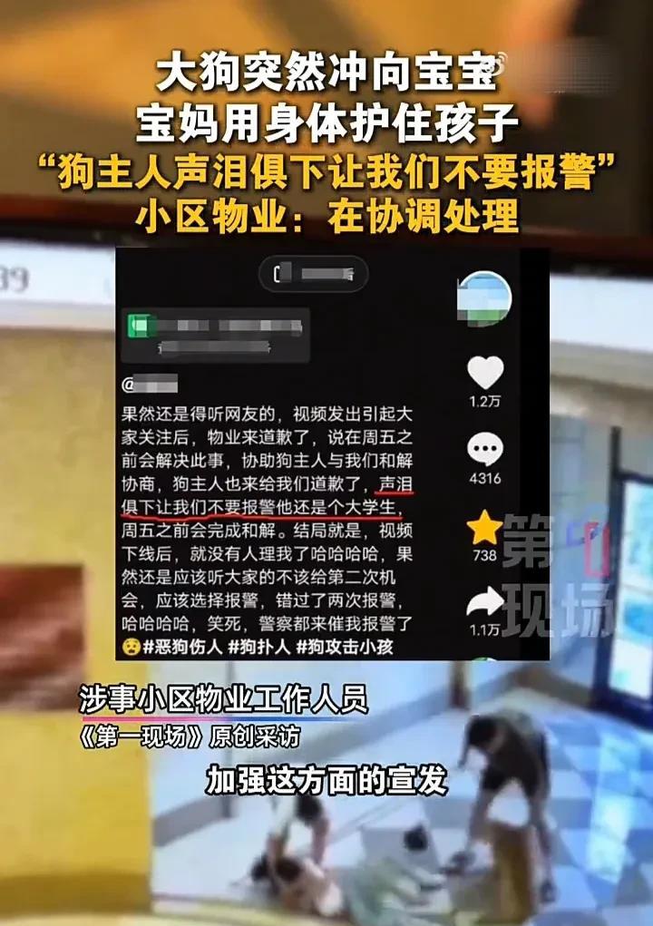 害人害己,这就是遛狗不拴绳的后果!近日,广东广州一位宝妈抱着1岁宝宝回家时,在小区楼下被一只没有拴绳的大狗扑倒,导致宝妈的腰部扭伤,宝宝的头部也磕到台阶,之后大狗主人声泪俱下求原谅,声称自己还是大学生,不要报警。