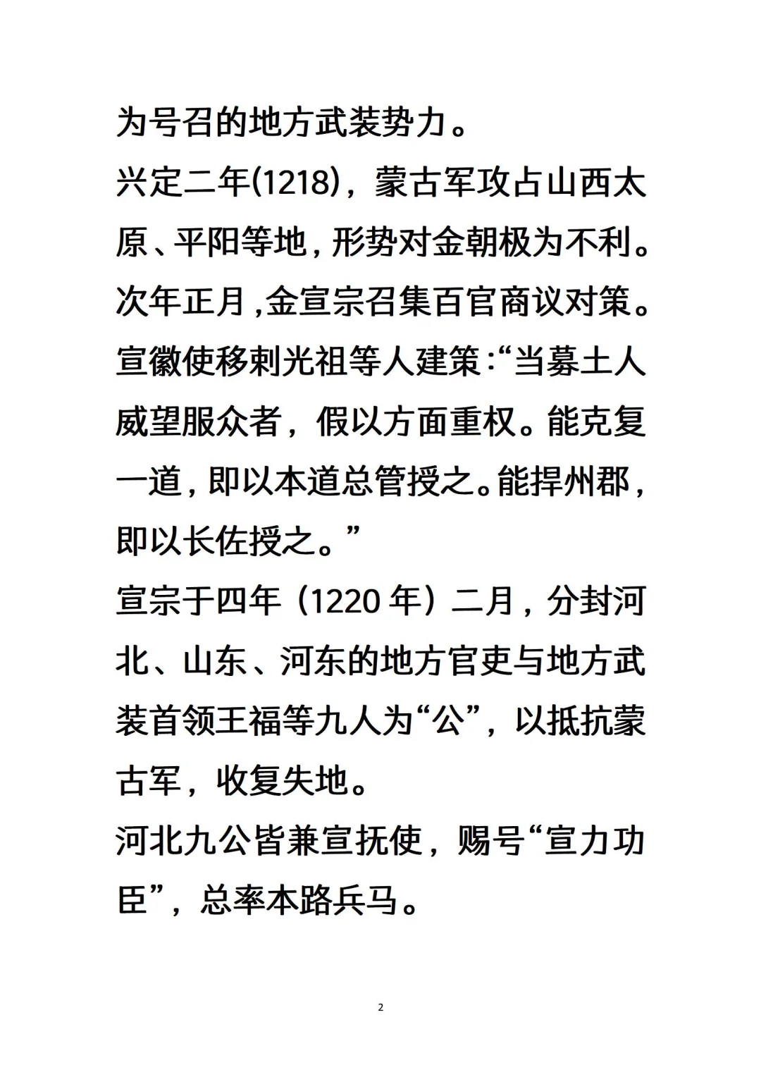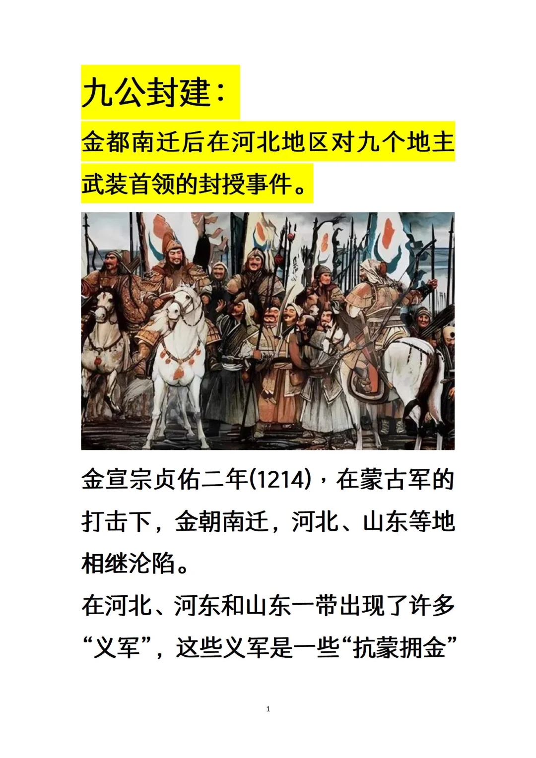 记录吧就现在 [大笑R]“九公封建”是金都南迁后在河北地区对9个地方武装首领的封授事件。 [微笑R]1214年金在蒙古军打击下被迫南迁,河北、山东等地相继失陷。1218 年,蒙古军攻占山西太原、平阳等地。1219 年正月,金宣宗召集百官商议对策,议定招募分封地方豪强抵御蒙古军。 [微笑R]1220年2月,金宣宗分封河北、山东、河东的地方官吏与地方武装首领王福等9人为“公”,皆兼任宣抚使,赐号“宣力功臣”,总率本路兵马,抵抗蒙古军,收复失地,史称“九公封建”。