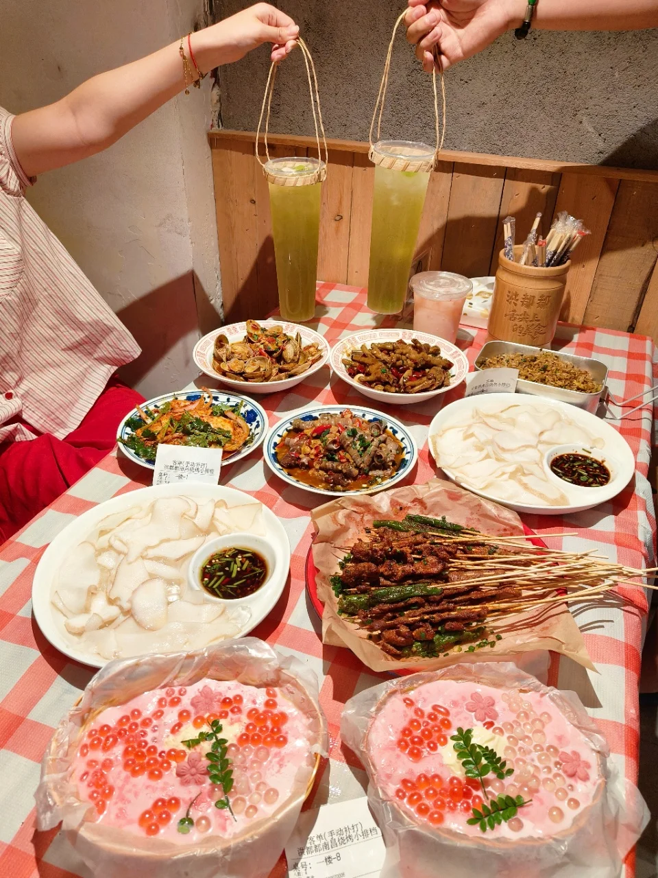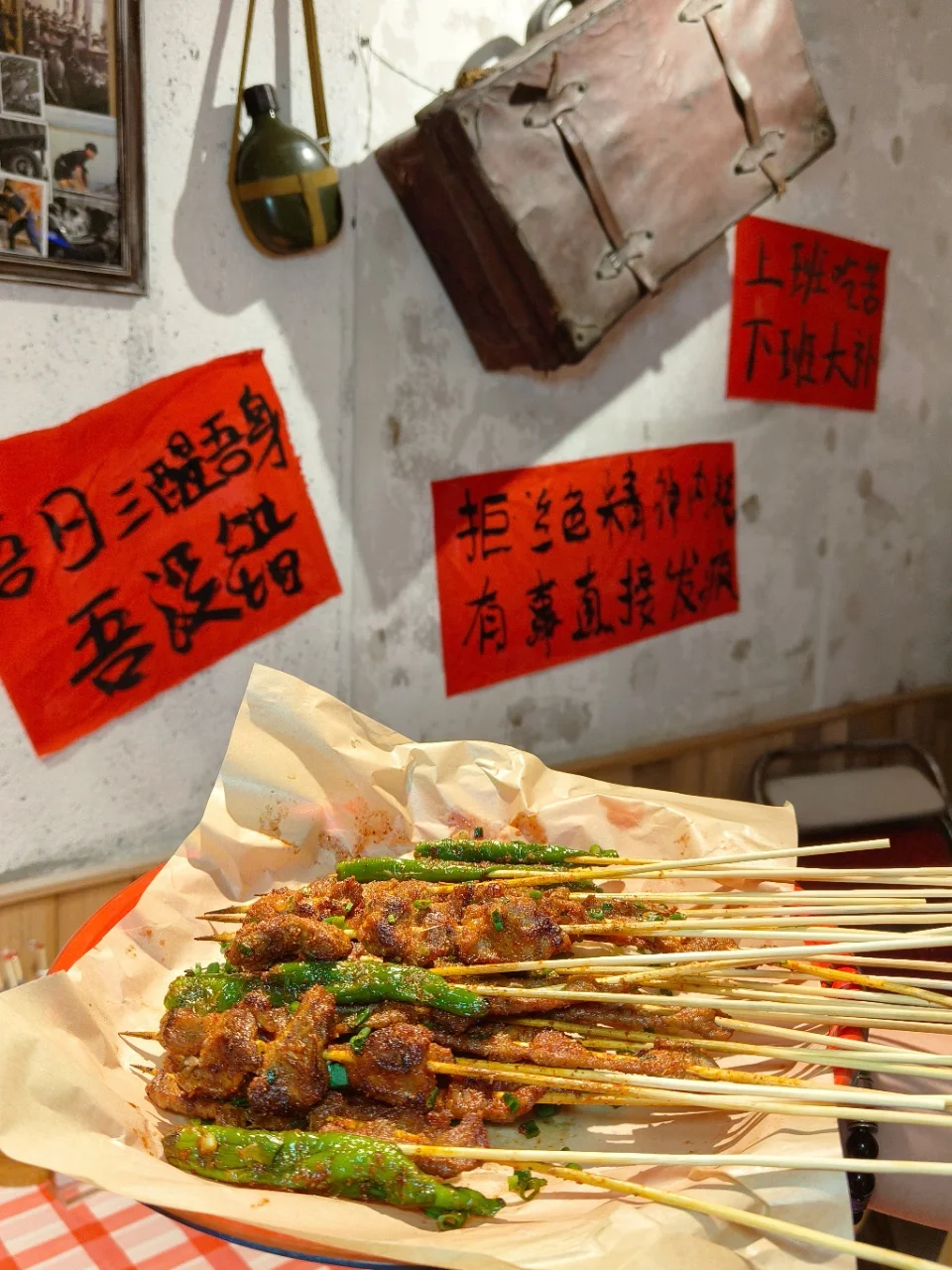 一进门就被复古装修戳中,暖黄灯光配着旧海报,驻唱歌手的歌声飘过来,氛围感直接拉满~ ▪️极品爆辣🌶牛肉串🍢:辣得嘶哈还想再撸😘 ▪️碳烤油边🍢:焦香裹着油脂香,完全不腻😋 ▪️冰镇芥末海螺片🐚:口感脆韧又带点芥末的冲,一口接一口,根本停不下来😍 ▪️还有碳烤鲫鱼🐠、樟树辣椒🌶,连烧鸡脚都炖得软烂入味👍 吃完咸的来口甜品🍮,樱花奶豆腐软fufu,茉莉青提荔枝饮🍸清爽到冒泡泡,最后用颗粒分明的蛋炒饭收尾🍛 在复古小店里听着歌,喝着酒撸着串,这才是夏天该有的样子啊✨