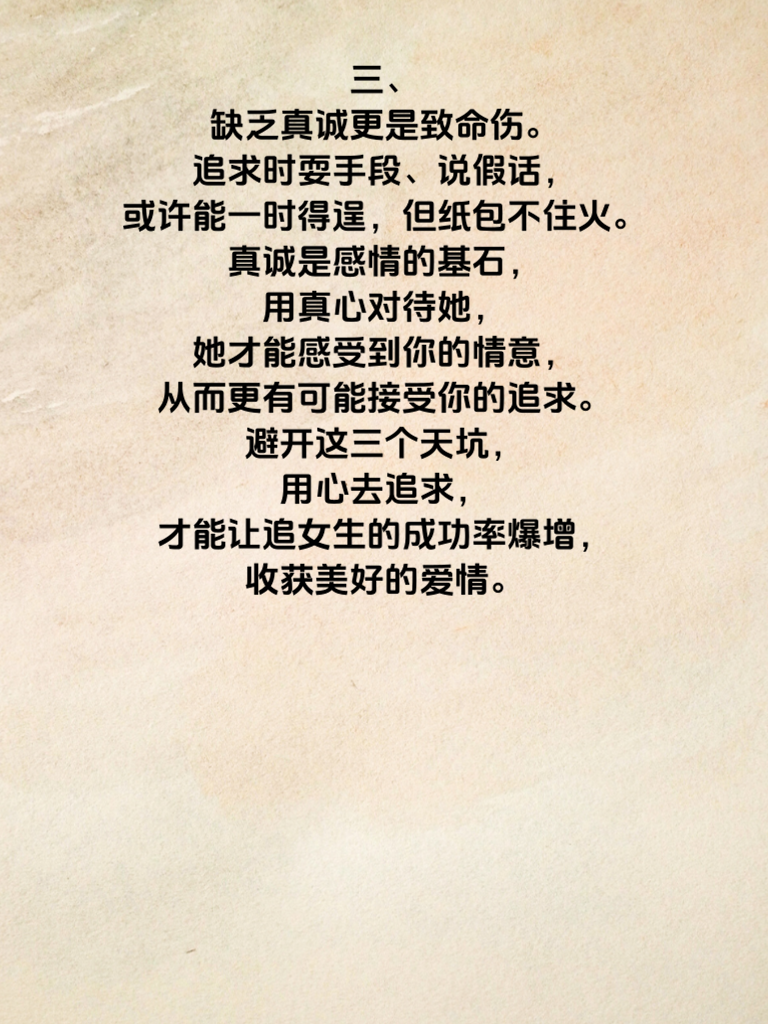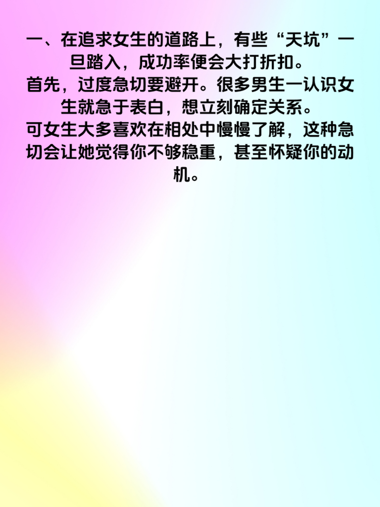 一、在追求女生的道路上,有些“天坑”一旦踏入,成功率便会大打折扣。首先,过度急切要避开。很多男生一认识女生就急于表白,想立刻确定关系。可女生大多喜欢在相处中慢慢了解,这种急切会让她觉得你不够稳重,甚至怀疑你的动机。 二、不懂倾听也是个大问题。女生倾诉时,有些男生只顾自己表达,不认真听对方说话。要知道,倾听是理解她的第一步,只有先听懂她的想法和感受,才能更好地走进她的内心。 三、缺乏真诚更是致命伤。追求时耍手段、说假话,或许能一时得逞,但纸包不住火。真诚是感情的基石,用真心对待她,她才能感受到你的情意,从而更有可能接受你的追求。避开这三个天坑,用心去追求,才能让追女生的成功率爆增,收获美好的爱情。