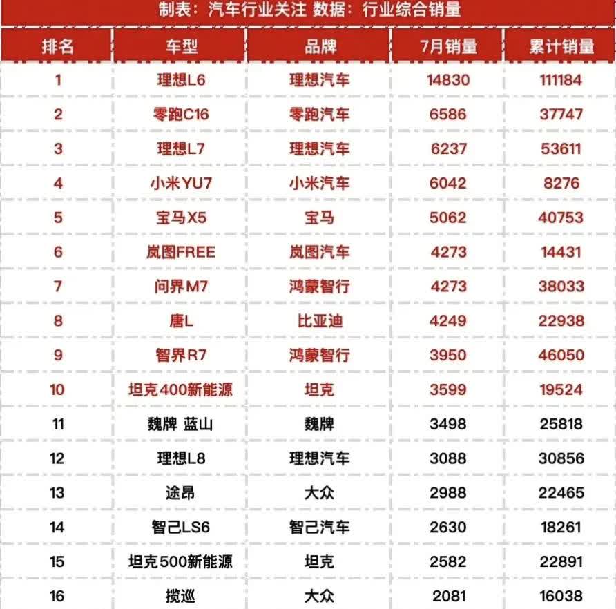 理想这成绩还是太理想! 看看这个榜单:L6、L7、L8全部上榜,7月L6遥遥领先! 岚图free改教新上市车表现亮眼,这销量也是很不错啦! 小米YU7产多少卖多少,数据真实反映工厂的产量!