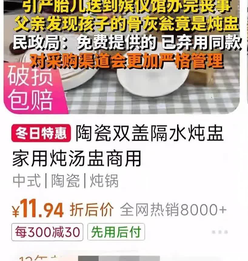 广东肇庆,一孕妇在医生的提议下,做了引产,丈夫心痛不已,将胎儿送到殡仪馆火化,并在殡仪馆为其选了一个骨灰瓮。岂料,事后男子去医院办事,发现医院给病人炖汤使用的炖盅和骨灰瓮极其相似,男子心里敲起了拨浪鼓,回到家中发现骨灰瓮上面贴着“某某福炖盅”的标签,男子怒了,找到殡仪馆讨要说法,对方是这样解释的。 在广东肇庆,有这么一对夫妻,陈明赫和高阳,他们盼孩子盼了好久,好不容易怀上了,结果在2024年6月,孩子因为一些问题没保住,得做引产。两人伤心得不行,医院那边又说,孩子得送去殡仪馆处理。陈明赫心疼老婆,就自己悄悄去办了火化手续,还给孩子挑了个骨灰瓮。殡仪馆的人给了他一个小骨灰瓮,他也没细看就收起来了。 可没想到,过了几天,他在医院里看到人家用来炖汤的盅,跟他买的骨灰瓮简直一模一样。他吓得赶紧回家看,结果一看,骨灰瓮底下还贴着“某某福炖盅”的标签呢。这下子,他又气又愧,觉得孩子连走后的一点尊严都没了。他一气之下,就找了媒体,要找殡仪馆讨个说法。一开始,殡仪馆说“没收钱”就不愿意负责,但记者在仓库里找到了好多一样的炖盅,这说明他们平时这些东西都是乱用的。舆论闹大了,殡仪馆没办法,只好承认自己管理上有问题,还说要改。 这事儿被曝光后,有关部门也开始查了,殡仪馆也答应要好好买东西了。虽然人已经没了,尊严也找不回来,但希望这次的事情能让大家更关心殡葬行业的管理。