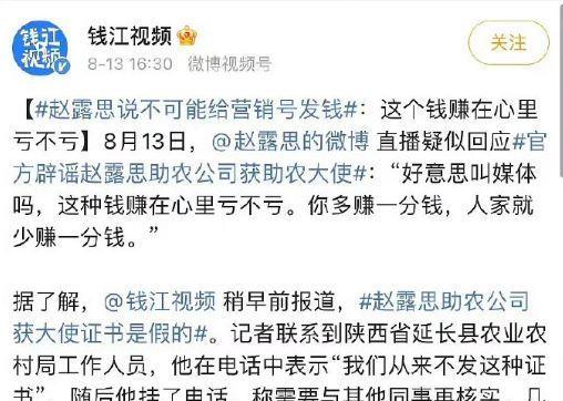 怼完经纪公司,怼媒体,赵露思半只脚已经踏出娱乐圈了! 赵露思在直播时,公开说:“钱江媒体好意思叫媒体吗?这个行业脏乱成这样都是你们这帮人导致,这种钱赚在心里亏不亏?” 之所以赵露思会这么说,是因为此前,钱江媒体曾公开发文称“赵露思助农公司获大使证书是假的”。 再加上有网友提出质疑,觉得赵露思直播时卖的苹果汁价格较高。因此,网上有人对赵露思的助农行为有了质疑。 对于赵露思的公开回应,钱江媒体直接给出了正面回复,称他们的报道都是经过求证的。 此事一出,立刻引起了网友们的关注。 有人觉得赵露思是在做好事,结果反被人指责、诬陷,很可怜。 还有人觉得赵露思就是在借着助农博眼球,吸引关注。 不管赵露思到底是真助农,还是蹭热度,有一点可以肯定的是,在经过怼经纪公司,又怼媒体的多番操作后,赵露思的半只脚几乎已经踏出娱乐圈了。 除非赵露思自己成立独立工作室,然后她还有够多,够坚实的娱乐圈人际关系。否则,现在的形势对赵露思来说,那真是十分不利了。#赵露思#