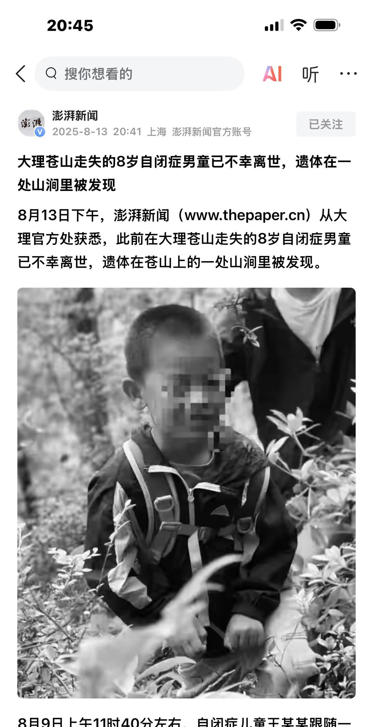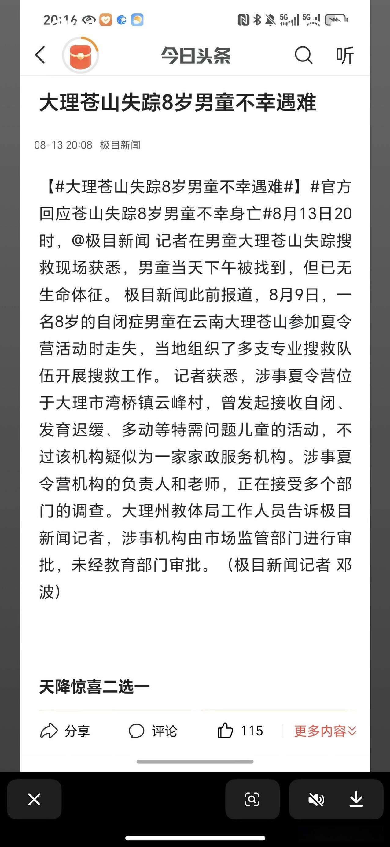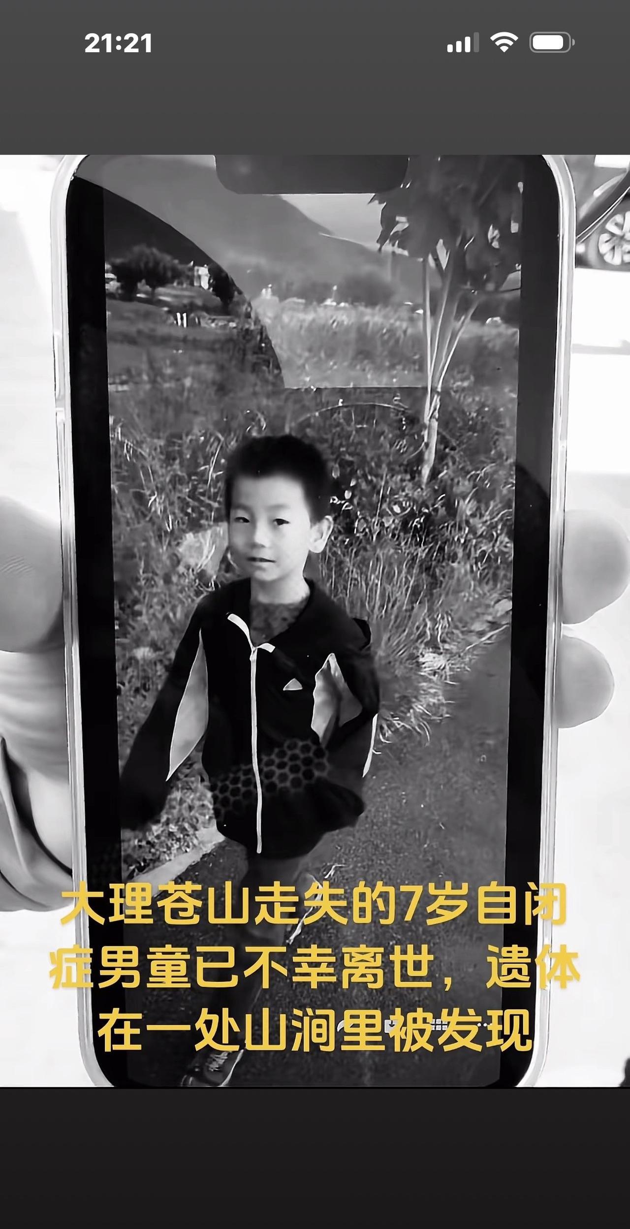 苍山走失的自闭症男童已遇难,孩子失温身亡,身体被小树枝和藤类覆盖住,旁边是小溪流。 据悉,孩子遗体被发现在一山涧处,具体位置是清碧溪山脚下。警方已封锁了进入护林站指挥部的路口,不让志愿者和其他人员进入,搜救队已经下撤。 太不幸了,有搜救人员说,下午5:00的时候就传来了消息,当时救护车开在路边等待,王一铠小朋友的爸爸妈妈也在等待确认消息,传来的确是令人心碎的噩耗。 孩子已经失踪四天,今天下午才找到。 本来苍山海拔4000多米,孩子失踪的地方是海拔2200米,山上气温易骤变,刚刚还是晴天,瞬间就可能刮风下雨,降至几度。这两天苍山确实下起了雨,搜索工作都很艰难。 不敢想象,7岁多的孩子,穿得那么单薄,就一件春秋运动外套,他失踪以后,面对大山密林走不出去,还可能有野生动物出没,他是多么恐惧啊,他还不知道呼喊,只是不停地的颤抖中一点点失温,最后没有了呼吸,去世前他会像卖火柴的小女孩一样,想念爸爸妈妈的温暖吗? 太让人心痛了! 不敢想,爸爸妈妈把自闭症的孩子有惊无险带到了七岁多,愿意每月交一万多块钱让他上特殊幼儿园,没想到会在远隔千里之外的苍山夏令营中出事。 夏令营机构之前是做家政的,怎么转向做起了儿童特殊教育呢,还是针对自闭症儿童,吹嘘说可以采用自然疗法治愈孩子,所以登山是必备项目。 可能爸爸妈妈病急乱投医吧,或者是太希望孩子好了,所以太轻信这些无良宣传了,这将是一辈子的后悔和自责了吧。 可怜的爸爸妈妈,他们也是受害者呀,这些无良的机构应该好好整顿了! [奋斗][奋斗]