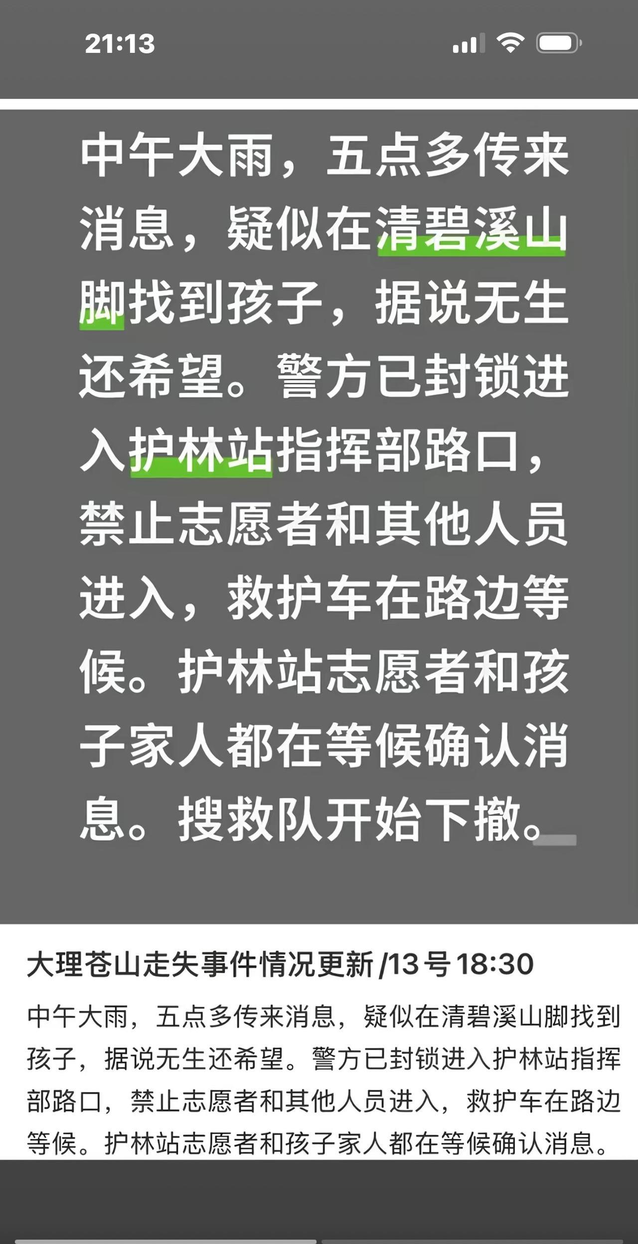 我是大理本地人,对当地的情况非常熟悉,也经常爬苍山。现在是雨季,坝区都一直下雨,山上基本上没有晴过。山上的路不好走,孩子应该走不远。4个老师带7个孩子,不应该把孩子走失了。山上气温很低,饥寒交迫,担惊受怕,孩子是坚持不了多长时间的,有可能当天晚上就不在了。安息吧,孩子,但愿天堂没有病痛。