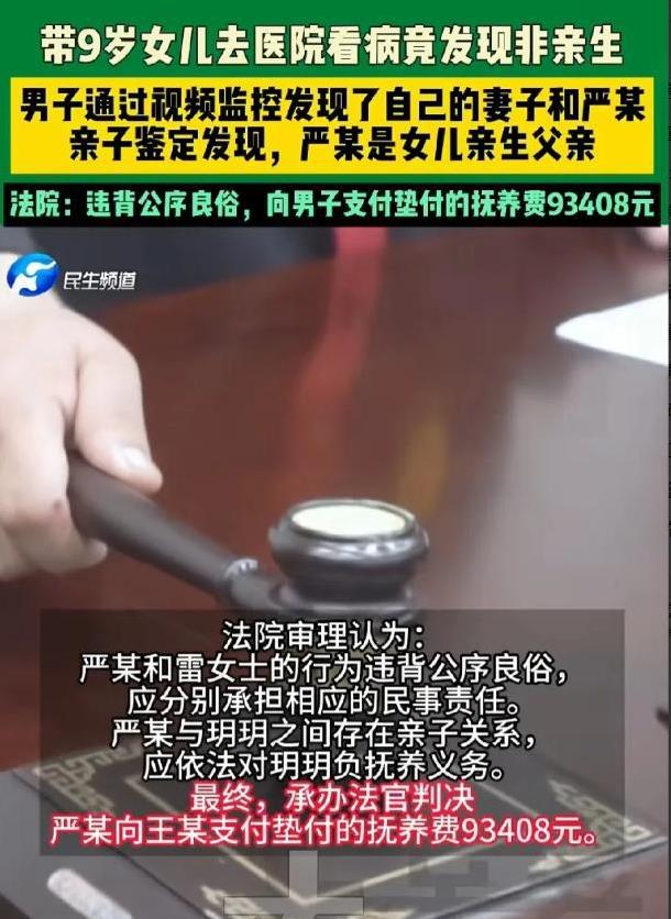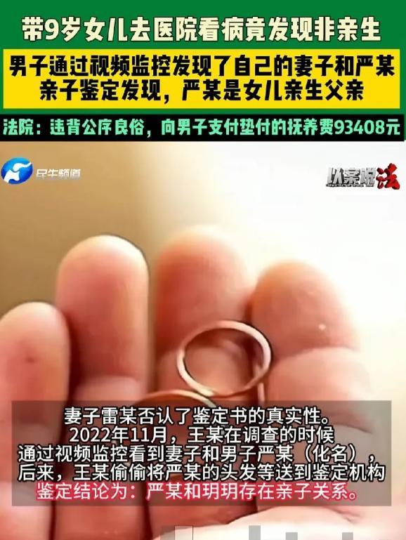湖北枣阳,男子带9岁女儿去医院看病时,发现女儿血型与自己不匹配,男子越想越不对,赶紧做了亲子鉴定,结果显示,女儿果然不是他亲生的。同床共枕的妻子竟给自己戴了这么大一顶绿帽子,男子气炸了,开始暗中调查,很快在监控视频发现了妻子的秘密,也找到了孩子的亲生父亲。为了出这口恶气,男子将妻子和第 三者告上法庭,索赔11万。 根据8月12日河南民生频道的报道,张先生(化名)和自己的妻子俩人早年间是通过他人介绍结识的,当初二人都已经到了结婚的年龄,所以俩人便迅速地举办了仪式,想着婚后在培养感情! 随后没多久的时间,张先生和妻子有了孩子,顺利的生下来了一个可爱的女儿,夫妻二人的感情,张先生自我感觉还特别不错,因为他为了这个家庭,可谓是尽心尽力,每天努力工作,就是为了能让妻女过上更好的生活! 随着时间的流逝,自己的女儿已经9岁了,但是最近女儿一直生病,并且不论张先生带着女儿看什么医生,吃了许多药,始终不见好转,看着女儿难受的样子,张先生直接带着女儿来到了大医院检查! 经过医生的一番检查,决定让女儿抽个血,然后检查一下到底是怎么回事,顺带给孩子做了一个血型检测,随后张先生便在医院静静等待着检查结果,想着赶紧让女儿的病情有所好转! 然而检查结果出来后,张先生连忙拿给医生看,这时候他竟然知道,自己的女儿血型竟然和他不同,这时候张先生就有点纳闷了,自己的亲生女儿血型竟然与他不同,感到疑惑的他连忙做了一个亲子鉴定,结果竟然表示排除张先生为女儿的生物学父亲! 看到这一结果,张先生愣在了原地,但是他并没有直接质问妻子,而是默默的进行调查,果然在他的一番调查下,发现自己的妻子竟然和一个男人特别亲密! 紧接着他通过了自己的一番调查,经过自己仔细的寻找下,找到了这个男人的一些头发,立即将这些毛发送到了鉴定机构,检查显示,这个男人和女儿存在亲子关系! 愤怒至极的张先生再也忍不住了,直接将妻子和这个陌生男人告上了法庭,觉得妻子违背公序良俗,要求妻子和男子赔偿自己11万元的补偿! 最终,承办法官判决,男子应向张先生支付抚养费,93408元! 这件事很快被曝光在了网上,事件一经曝光,在网上迅速地,引起了众多网友的热议: 有的网友称道:“没发现的多了。有的养到老了60多岁才发现,孩子都30多了。一次输血才发现不是自己亲生的!” 还有的网友说道:“仅仅是赔偿付出的钱财,对破坏婚姻通奸没有法律制裁吗?没有精神损害赔偿吗? 中华民族传统价值观已经被西方渗透得体无完肤,通奸古代是入罪的!” 那么,对于这件事,大家有什么看法? 信源:河南民生频道