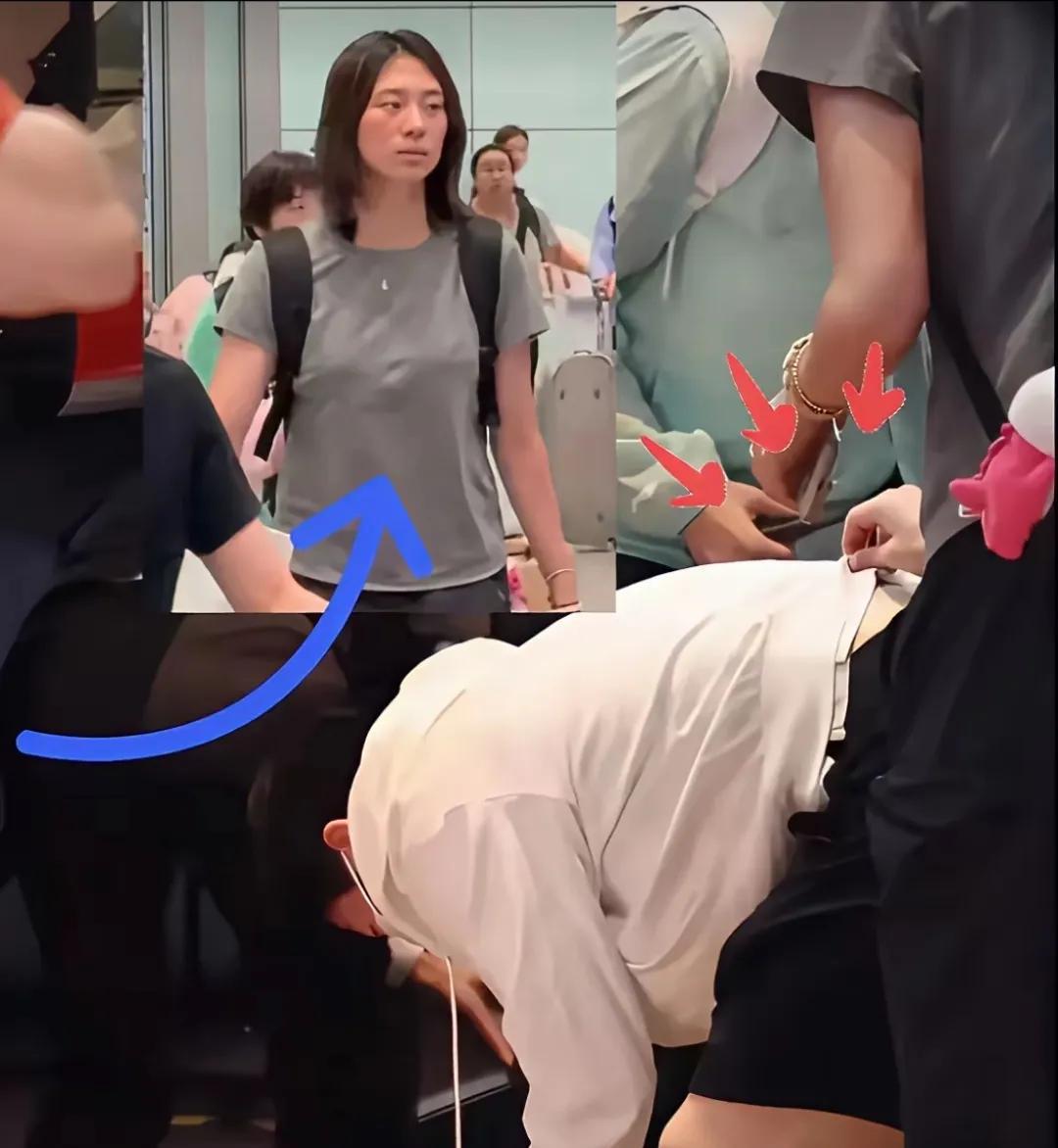 有人分析出在羽田机场为莎莎拉衣服的女孩陈熠。 莎莎在机场,弯腰收拾行李,上衣滑上