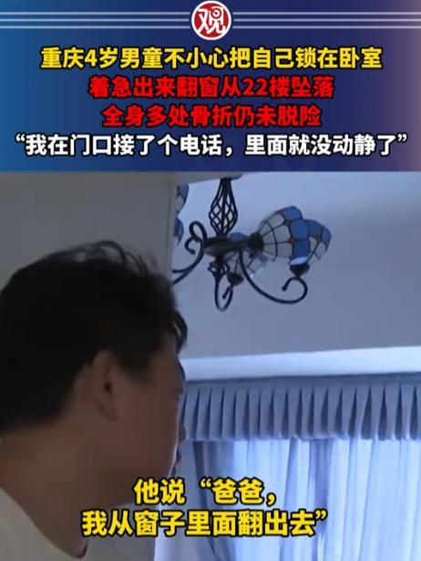 痛心!重庆4岁半男孩冉冉与1岁妹妹在客厅玩耍时跑进主卧,房门意外反锁。父母尝试开门近10分钟未果,冉冉隔着门喊:“爸爸,我从窗子翻出去就能出去了!”那可是22楼啊! “爸爸现在马上就将门打开了,千万不要从窗户跳出去!这可是22楼的高度,在屋子里等着爸爸!”张先生(化名)对着房间内的儿女,着急的说道! 事发当天的时候,张先生一家四口正在家中休息,吃过午饭后,张先生想着和妻子俩人午休一会,但是两个孩子的精力仿佛特别充沛,他们一直在家里面玩耍,一会看看电视,一会玩一会玩具! 然而当家中所有的玩具都被两个孩子玩了一遍后,4岁半的冉冉和妹妹二人决定,他们在屋子内跑耍,不停的在各个卧室里面穿梭,孩子们玩乐的声音,被卧室内的张先生和妻子听的一清二楚! 但是过了没多久的时间,在卧室躺着的张先生,竟然听不到孩子们的吵闹声了,随即他便立刻从床上起来了,他便来到客厅呼喊着孩子冉冉的名字! 这时候张先生听到孩子的声音从另外一个卧室里面传出,然而当张先生准备推开门查看孩子们的情况时,竟然发现房间门意外的反锁住了,张先生想让孩子把房间门给打开,告诉孩子怎么样做能够将反锁的房门开开! 经过了一番教导,孩子却怎么样都打不开被反锁的门,因为他们也按照了父亲张先生的指导去做了,但是这个门就是打不开,张先生和妻子在外面也一直尝试着各种方法! 经过了十分钟的时间,张先生打不开门想要打个电话叫人过来帮忙,因为不想将房门给损坏掉,然而正在门外打电话的张先生,突然听到了儿子的话:“爸爸,我从窗户翻出去,就能够从房间内出去了!” 听到孩子说的话后,张先生立马惊慌不已,立刻用力的将房间门给打开了,然而打开门之后,张先生发现房间内只剩下女儿一人在地上嚎啕大哭,并且房间内的窗户,竟然是打开的! 看到这一幕张先生连忙来到了窗户跟前,发现儿子掉落在小区的绿化带中,他们夫妻二人连忙下楼,并且拨打了120急救电话,连忙下楼查看孩子的情况,救护车也迅速地赶到了现场,如今孩子还在重症监护室治疗,因为身体多处骨折,幸好绿化带进行了缓冲,但是孩子仍一直处于昏迷中! 这件事很快被曝光在了网上,事件一经曝光,在网上迅速地,引起了众多网友的热议: 有的网友称道:“家长在这种情况下首先自己不要乱,稳住孩子情绪,告诉他就坐在地上玩,或者就躺在那睡一会,一会就把门打开了,爸爸妈妈一直在这陪着你也可以一直聊天。” 还有的网友说道:“人的生命大于天,增强安全意识,安全教育要从娃娃做起,孩子的安全防护容不得半点松懈!” 那么,对于这件事,大家有什么看法?