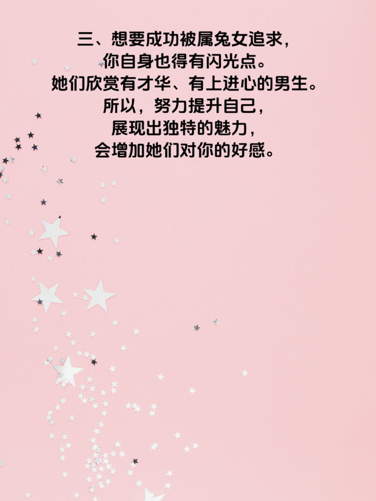 一、属兔的女生,温柔似水,内心细腻且情感丰富。她们对待感情真诚而专一,一旦陷入爱河,便会全心全意付出。若你有幸被属兔女倒追,那可得好好珍惜这份难得的深情。 二、属兔女倒追指数爆表,并非毫无缘由。她们通常有着敏锐的感知力,能轻易察觉到心仪之人的点滴情绪变化。当她们认定一个人时,会勇敢地迈出第一步。 三、想要成功被属兔女追求,你自身也得有闪光点。她们欣赏有才华、有上进心的男生。所以,努力提升自己,展现出独特的魅力,会增加她们对你的好感。 四、和属兔女相处,要给予她足够的尊重与理解。她们心思细腻,可能会在意很多小细节。耐心倾听她的想法,让她感受到你的温暖与体贴,感情便能升温。 五、属兔女在感情中往往比较含蓄,她们不会过于直白地表达爱意。所以,你也要学会读懂她的暗示,适时回应,让这份感情在你来我往中甜蜜发展。