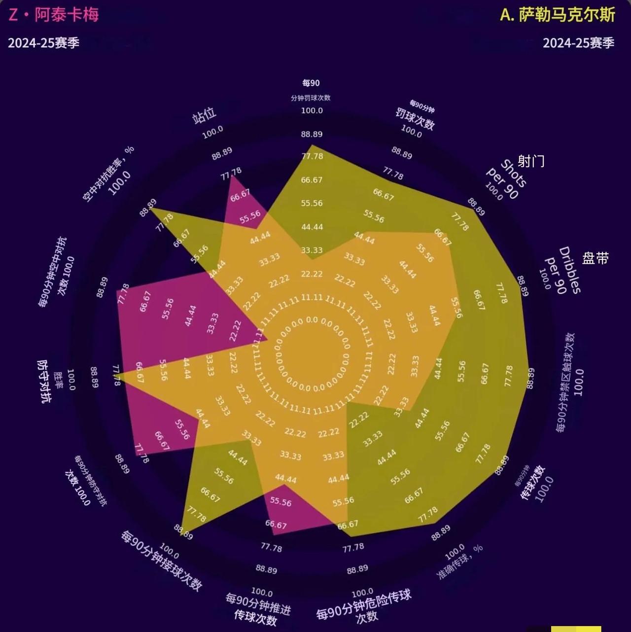 米兰新援阿泰卡梅数据。做了一个和萨勒马克尔斯的对比,可能大家看着更一目了然。其实