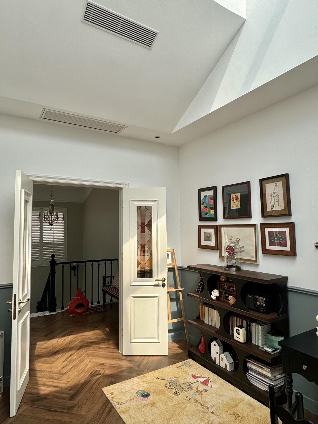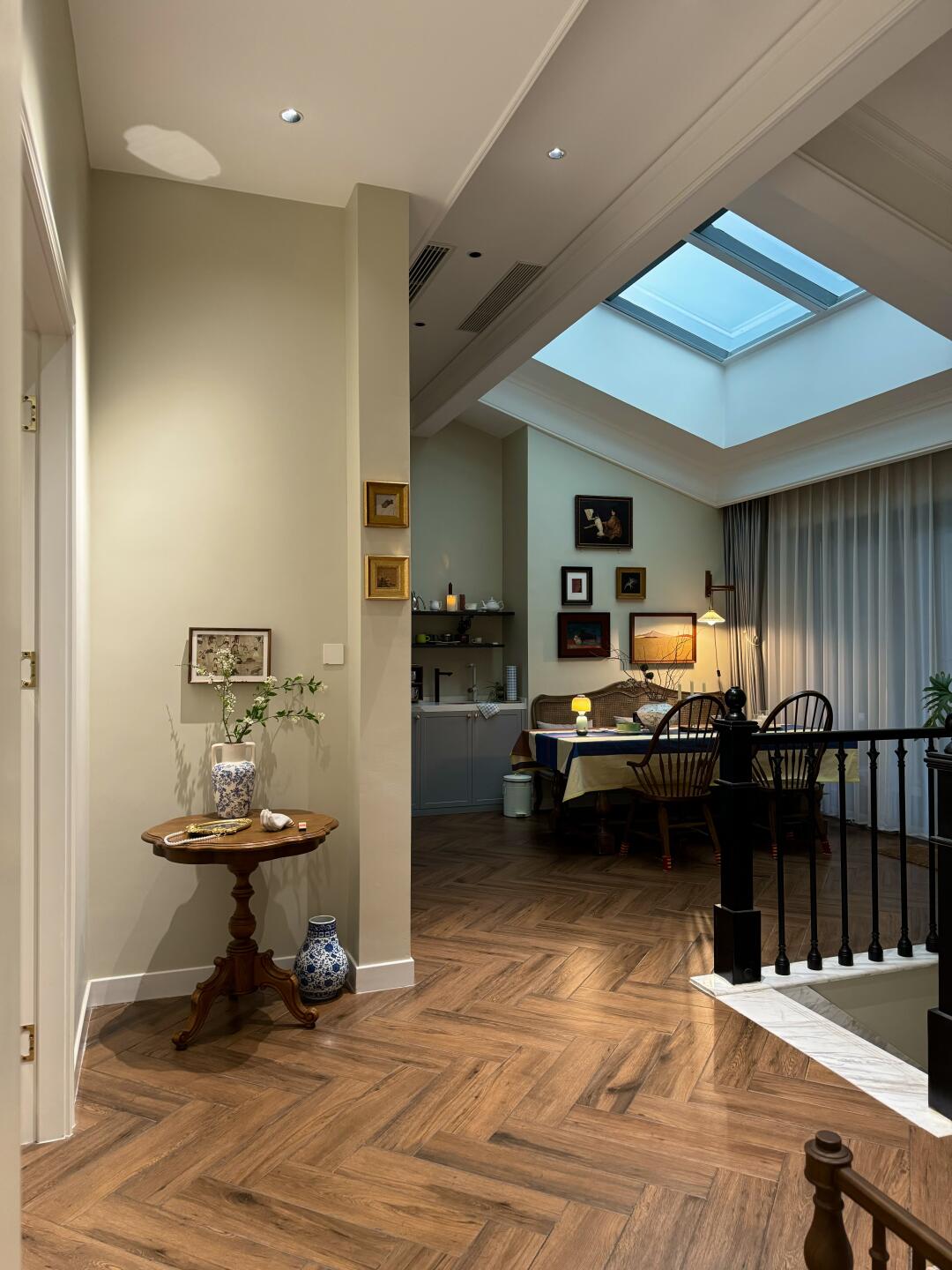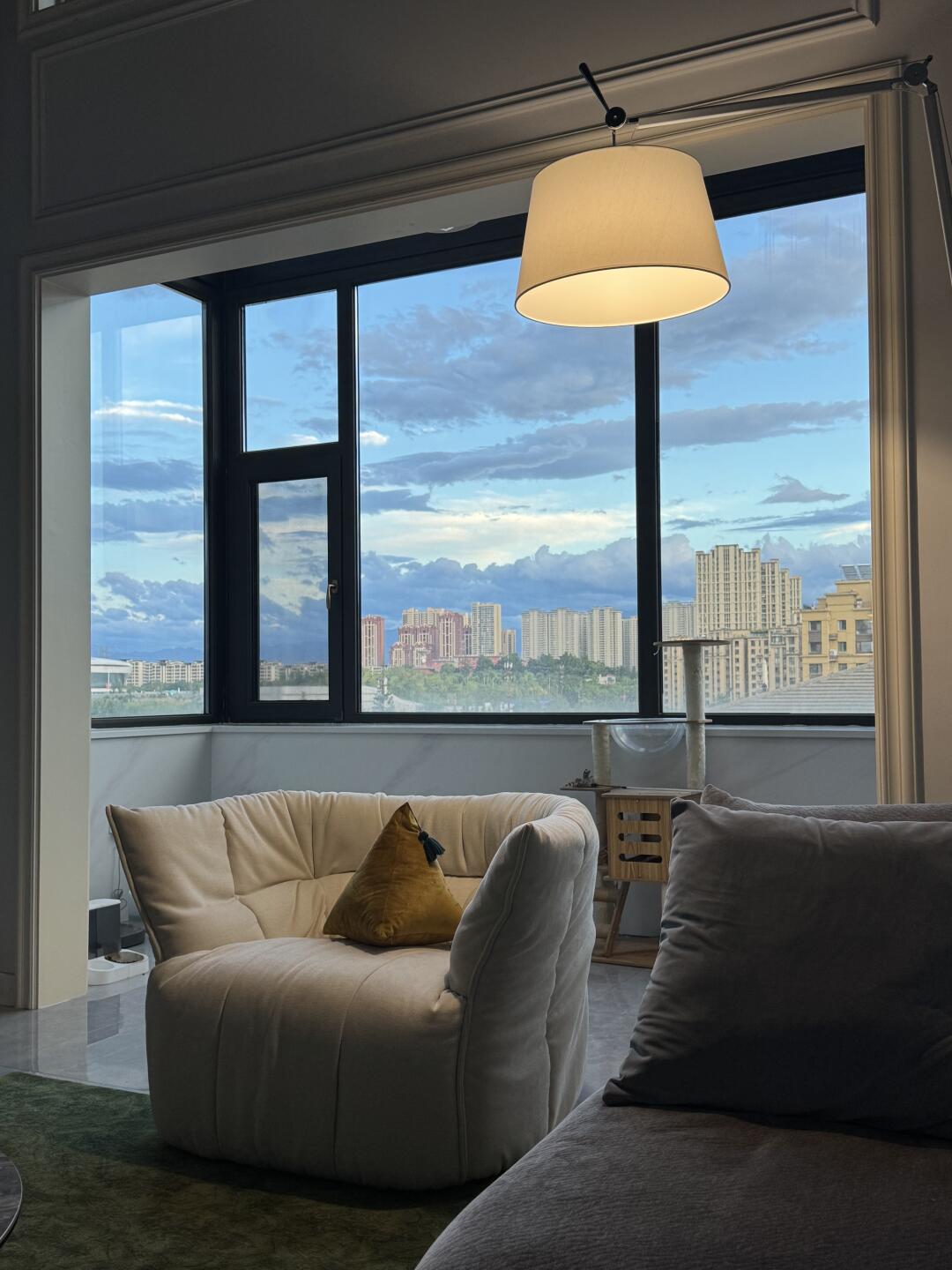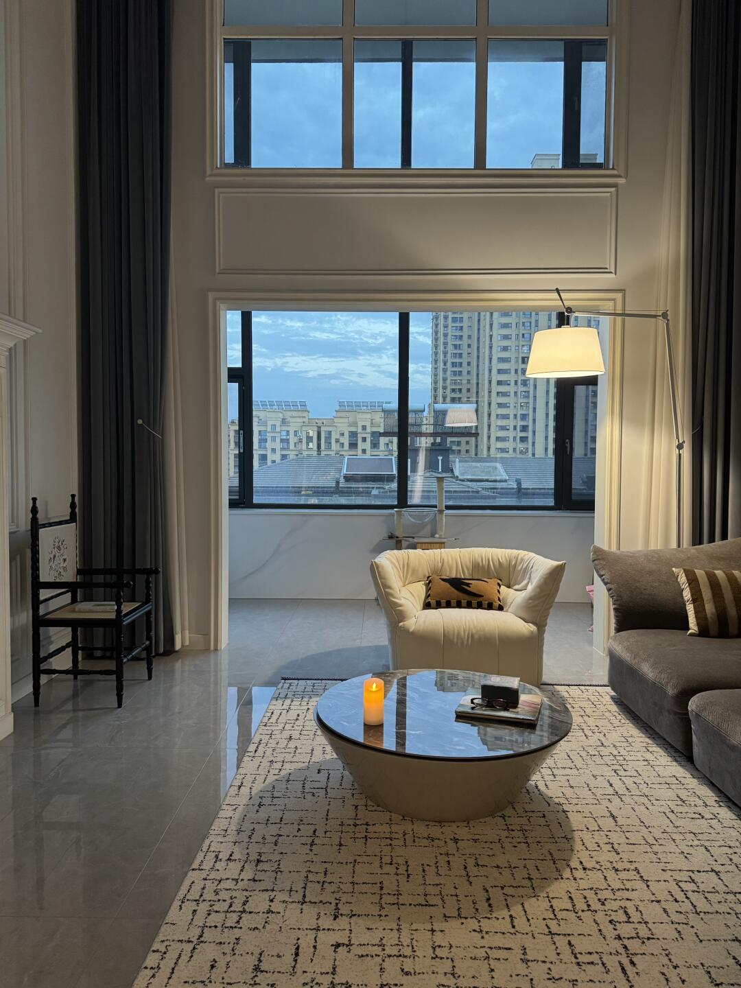 顶楼复式 客厅原始户型有个不规则7米的挑空 做了人字顶后还有6米. 保留下来的好处多多 层高高 通风好 换了几扇大面积玻璃 每天回到家都能看到不同视角下 五颜六色的家!