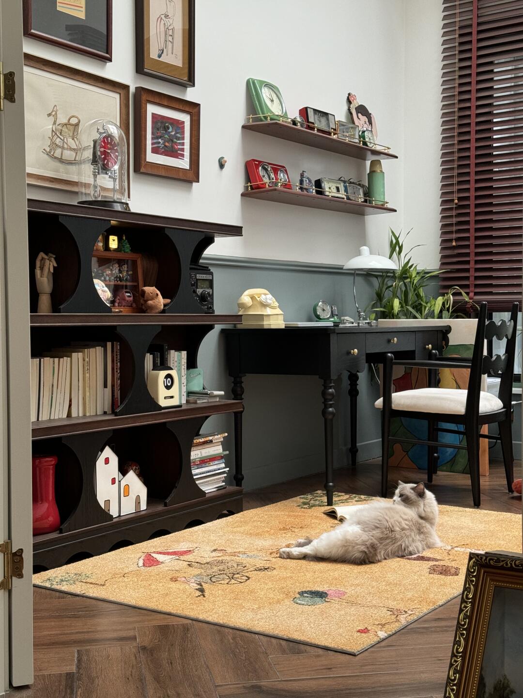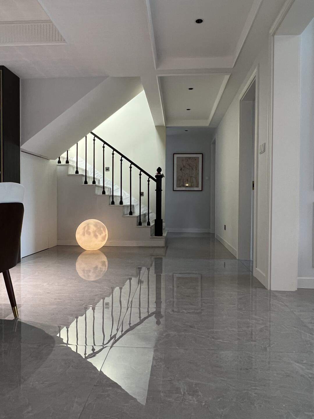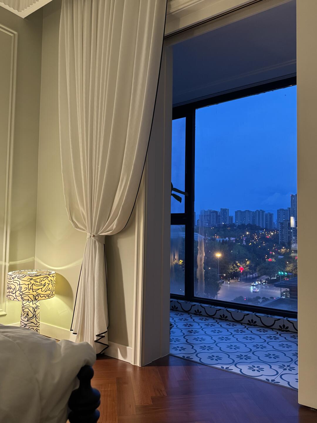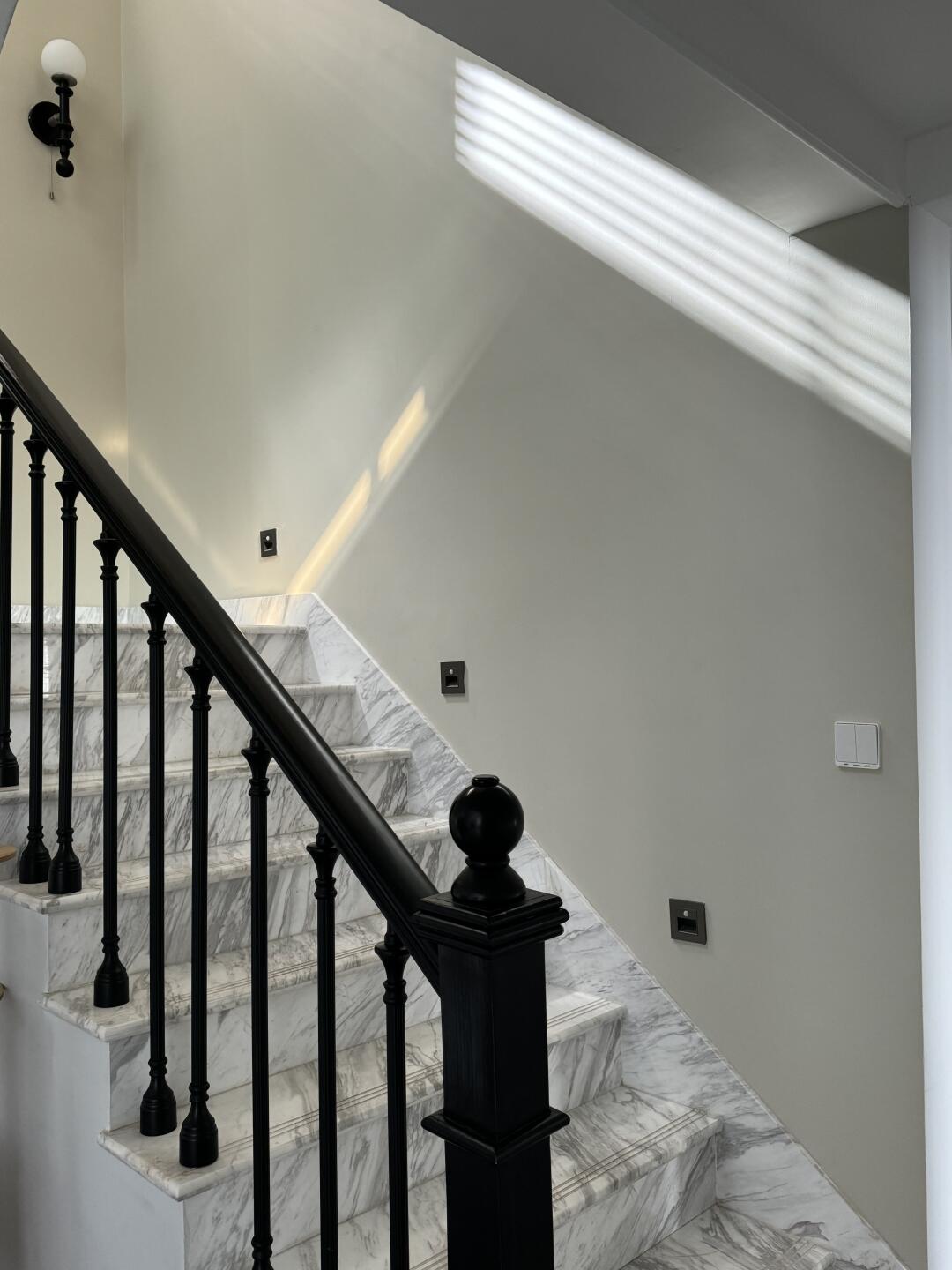 顶楼复式 客厅原始户型有个不规则7米的挑空 做了人字顶后还有6米. 保留下来的好处多多 层高高 通风好 换了几扇大面积玻璃 每天回到家都能看到不同视角下 五颜六色的家!