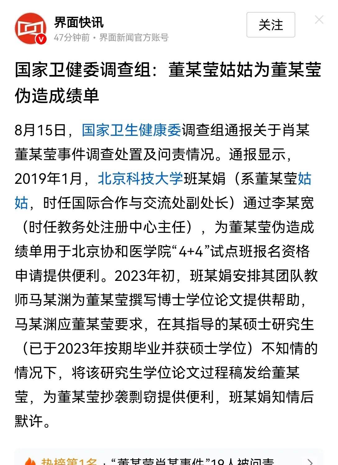 前一阵子,国家卫健委调查组,公布了董袭莹协和医院4+4项目的“入学资格造假”、“抄袭剽窃、科研诚信”等问题。 今天,国家卫健委调查组,又继续公布了调查细节:董袭莹的姑姑班晓娟,2019年为董袭莹伪造成绩单,用于协和4+4项目报名;并于2023年安排团队,为其撰写博士学位论文,并将其他人的论文交给董袭莹剽窃。 看看这一家子的所作所为,就能明白,啥叫“学阀”。班晓娟,可不是普通的高校教师,她是国务院特殊津贴专家、中国人工智能学会会士、北京科技大学的副院长、研究生导师……他们这个圈子里的人,才是真正能够做到紧密联系在一起、直接“制定规则”的人,然后在他们自己制定的规则下,让他们的后代,合理合法的享受到从入学、到毕业,一条龙式的团队服务,世代享有特权。 不然呢,像协和医学院4+4那种项目,普通老百姓的孩子,学习成绩再好,摸得到吗[笑哭][捂脸][不看][泪奔]?