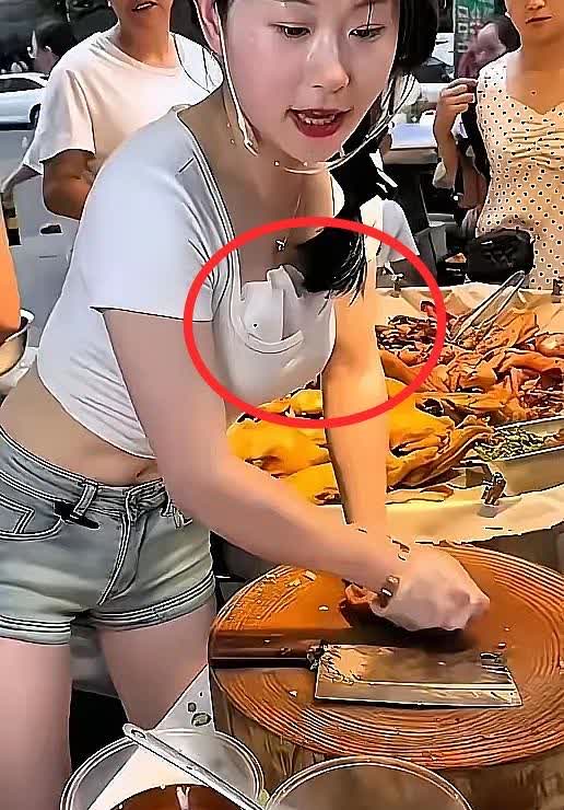 街头卖卤味的这个女子“社会性死亡”了! 夜市街头,有一个女子跟往常一样一边开着直播一边卖卤味。随着她切东西的动作不断有汗水冒出来,从脸上滑落到脖子最后消失在衣领处。 这个时候有顾客好心提醒她,让她擦一下汗水,又指了下她的胸口处,意思不言而喻,她的穿着太暴露了,动作幅度大一点的话很容易走光,尤其她还在直播,影响不好。 确实,光从图片上,这个女子穿着超低胸T恤,还露出一截小蛮腰,牛仔短裤看起来也是很清凉。虽说穿衣自由,但是这样犹抱琵琶半遮面的穿着打扮,很容易引起争议。 女子也不尴尬,笑了笑就直接塞了几张餐巾纸,遮住了胸口。不过也有人说这是女子的营销策略,三十六计中的一计——欲擒故纵。 大家觉得这个美女老板这样穿有问题吗?