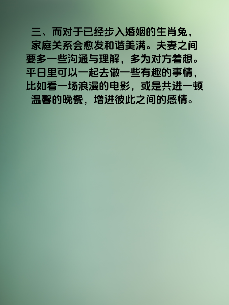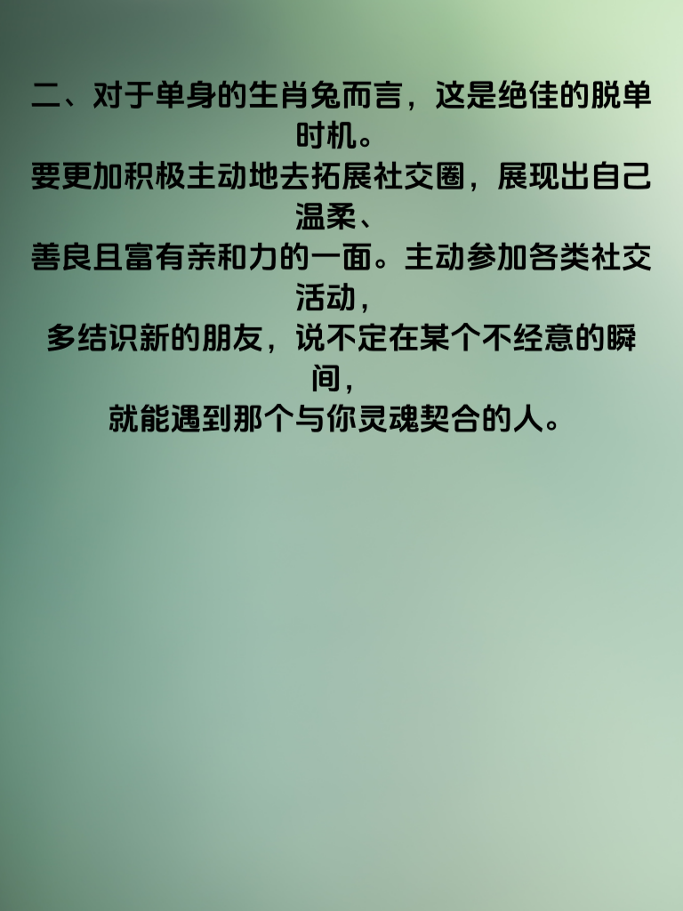 一、生肖兔的朋友们,在爱情与婚姻的道路上,正迎来双吉星高升的美好时刻。这预示着你们的感情生活将充满甜蜜与顺遂。 二、对于单身的生肖兔而言,这是绝佳的脱单时机。要更加积极主动地去拓展社交圈,展现出自己温柔、善良且富有亲和力的一面。主动参加各类社交活动,多结识新的朋友,说不定在某个不经意的瞬间,就能遇到那个与你灵魂契合的人。 三、而对于已经步入婚姻的生肖兔,家庭关系会愈发和谐美满。夫妻之间要多一些沟通与理解,多为对方着想。平日里可以一起去做一些有趣的事情,比如看一场浪漫的电影,或是共进一顿温馨的晚餐,增进彼此之间的感情。 四、在这个阶段,生肖兔要学会把握机会,珍惜身边人。用真心去对待爱情和婚姻,相信凭借这份真诚与努力,爱情会更加甜蜜,婚姻会更加稳固,让双吉星的光芒持续照耀你们幸福的旅程。