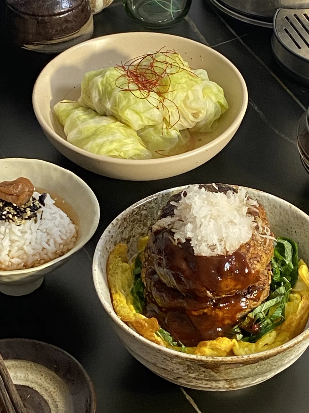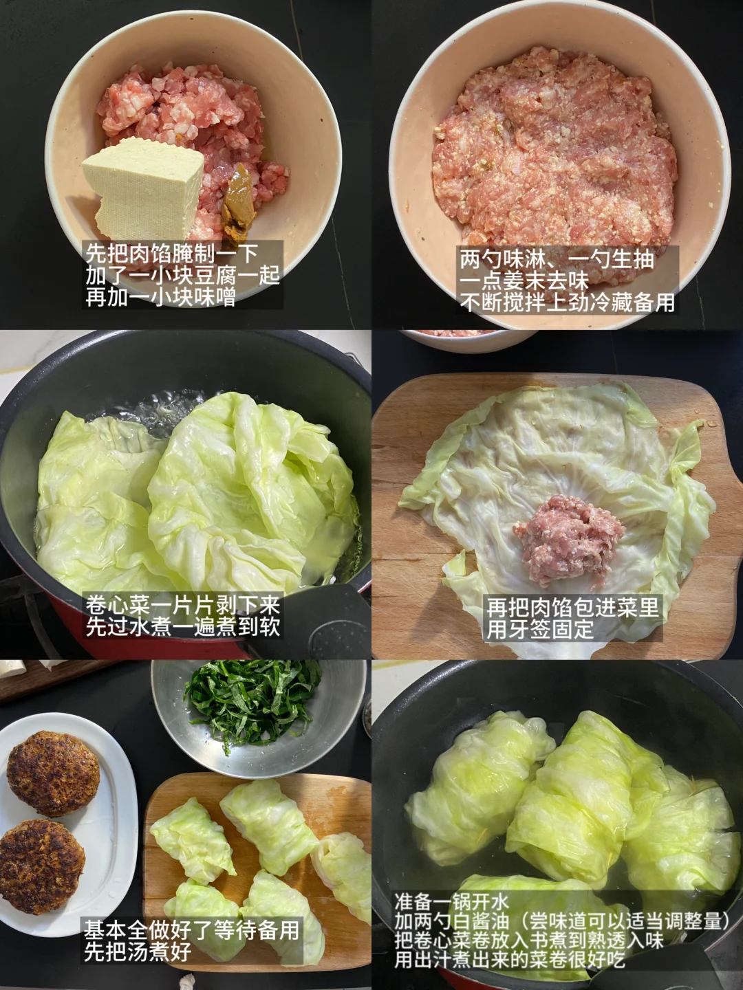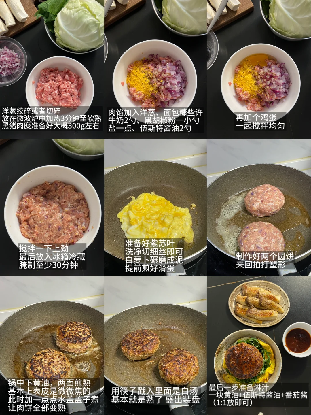 今天是清淡的日式食谱,双层肉饼搭配着茶泡饭,一点不腻可好吃了,食谱如下: ——————【紫苏肉饼】—————— 猪肉馅300-350g|洋葱1/3个|鸡蛋1个|面包糠适量|牛奶2勺|黑胡椒粉|伍斯特酱油|绿紫苏4片|白萝卜 肉馅腌制: 1)洋葱绞碎或者切碎,放在微波炉中加热3分钟至软熟 2)肉馅加入洋葱、鸡蛋1个、面包糠些许、牛奶2勺、黑胡椒粉一点、盐一点、伍斯特酱油1勺,搅拌一下上劲,最后放入冰箱冷藏,腌制至少30分钟 制作: 1)准备好紫苏叶,洗净切细丝即可,白萝卜碾磨成泥,提前煎好滑蛋 2)制作好两个圆饼,来回拍打塑形 3)锅中下黄油,两面煎熟,基本上表皮是微微焦的,此时加一点点水盖盖子煮让肉饼全部变熟 4)用筷子戳入里面是白汤基本就是熟了,盛出装盘,最后一步准备淋汁:一块黄油+伍斯特酱油+番茄酱(1:1放即可) ——————【卷心菜卷】—————— 食材: 卷心菜|肉馅200g|豆腐|味噌|姜|味淋|生抽|白酱油(白出汁) 步骤: 1)先把肉馅腌制一下,加了一小块豆腐一起,再加一小块味噌、两勺味淋、一勺生抽、一点姜末去味,不断搅拌上劲冷藏备用 2)卷心菜一片片剥下来,先过水煮一遍煮到软,再把肉馅包进菜里,用牙签固定 3)准备一锅开水,加两勺白酱油(尝味道可以适当调整量),把卷心菜卷放入书煮到熟透入味,用出汁煮出来的菜卷很好吃 ——————【煎杏鲍菇】—————— 步骤: 1)杏鲍菇划花刀,放锅中煎到两面焦黄即可,盛出撒黑胡椒海盐 - 做了n多次不会出错的肉饼饭!新鲜的黑猪肉糜配上伍斯特酱油特好吃,逛叮咚买菜的时候看到黑钻世家川藏特色黑猪肉糜,三七肥瘦刚好用来做肉饼很合适,详细看了黑猪肉品质还是很高的,生态养殖300天出来的肉,吃着安全放心,口感也更佳!平常经常用叮咚买菜,买回来的菜质量好又放心,能买的菜品鲜肉种类也很多,很不错!