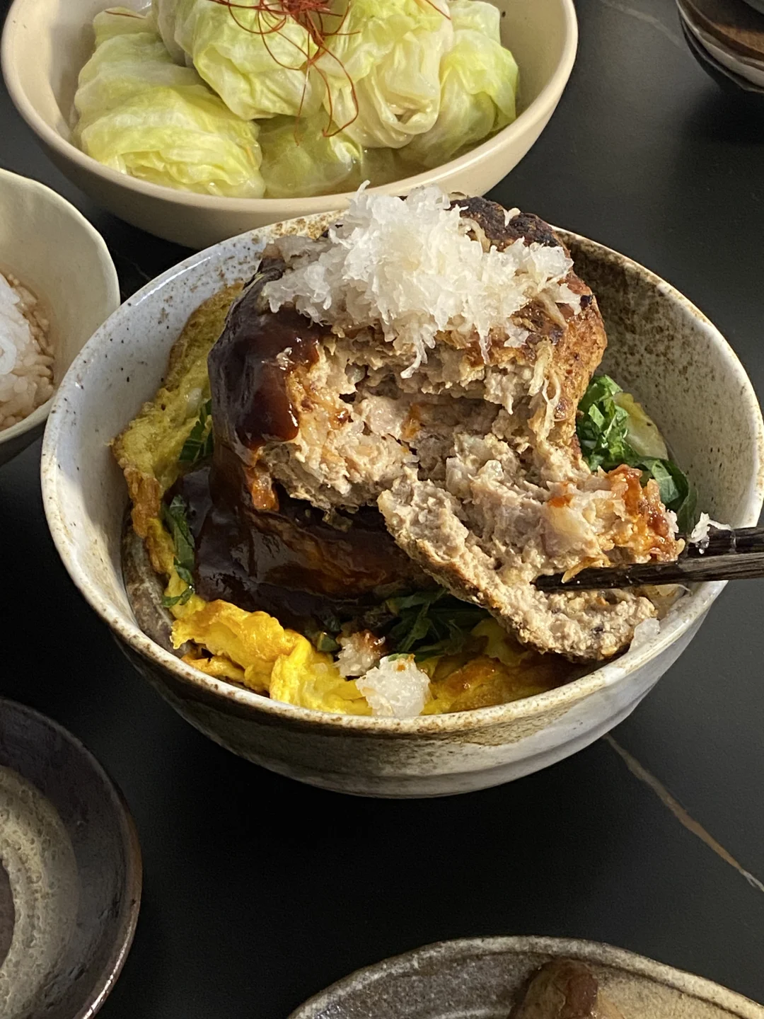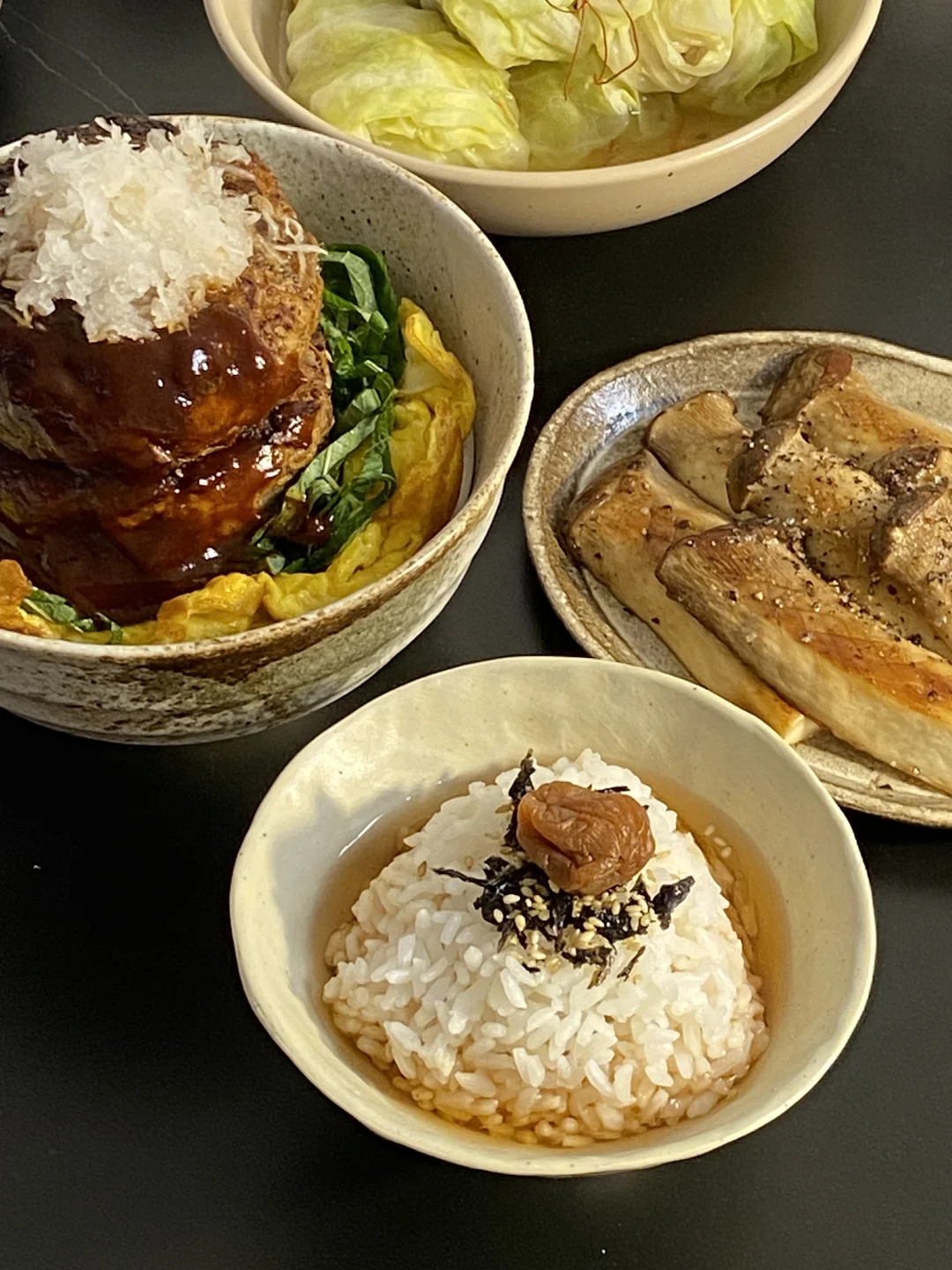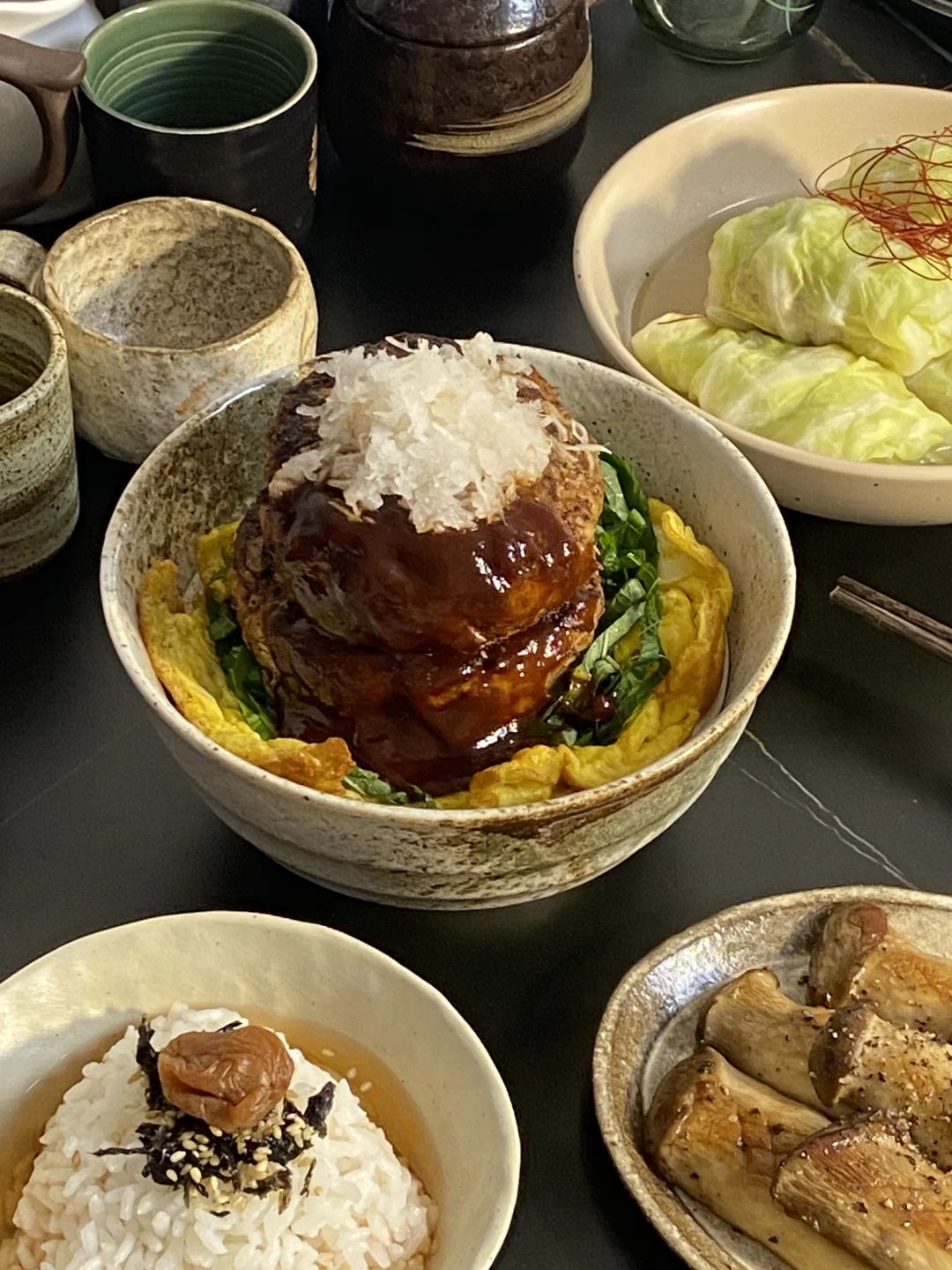今天是清淡的日式食谱,双层肉饼搭配着茶泡饭,一点不腻可好吃了,食谱如下: ——————【紫苏肉饼】—————— 猪肉馅300-350g|洋葱1/3个|鸡蛋1个|面包糠适量|牛奶2勺|黑胡椒粉|伍斯特酱油|绿紫苏4片|白萝卜 肉馅腌制: 1)洋葱绞碎或者切碎,放在微波炉中加热3分钟至软熟 2)肉馅加入洋葱、鸡蛋1个、面包糠些许、牛奶2勺、黑胡椒粉一点、盐一点、伍斯特酱油1勺,搅拌一下上劲,最后放入冰箱冷藏,腌制至少30分钟 制作: 1)准备好紫苏叶,洗净切细丝即可,白萝卜碾磨成泥,提前煎好滑蛋 2)制作好两个圆饼,来回拍打塑形 3)锅中下黄油,两面煎熟,基本上表皮是微微焦的,此时加一点点水盖盖子煮让肉饼全部变熟 4)用筷子戳入里面是白汤基本就是熟了,盛出装盘,最后一步准备淋汁:一块黄油+伍斯特酱油+番茄酱(1:1放即可) ——————【卷心菜卷】—————— 食材: 卷心菜|肉馅200g|豆腐|味噌|姜|味淋|生抽|白酱油(白出汁) 步骤: 1)先把肉馅腌制一下,加了一小块豆腐一起,再加一小块味噌、两勺味淋、一勺生抽、一点姜末去味,不断搅拌上劲冷藏备用 2)卷心菜一片片剥下来,先过水煮一遍煮到软,再把肉馅包进菜里,用牙签固定 3)准备一锅开水,加两勺白酱油(尝味道可以适当调整量),把卷心菜卷放入书煮到熟透入味,用出汁煮出来的菜卷很好吃 ——————【煎杏鲍菇】—————— 步骤: 1)杏鲍菇划花刀,放锅中煎到两面焦黄即可,盛出撒黑胡椒海盐 - 做了n多次不会出错的肉饼饭!新鲜的黑猪肉糜配上伍斯特酱油特好吃,逛叮咚买菜的时候看到黑钻世家川藏特色黑猪肉糜,三七肥瘦刚好用来做肉饼很合适,详细看了黑猪肉品质还是很高的,生态养殖300天出来的肉,吃着安全放心,口感也更佳!平常经常用叮咚买菜,买回来的菜质量好又放心,能买的菜品鲜肉种类也很多,很不错!