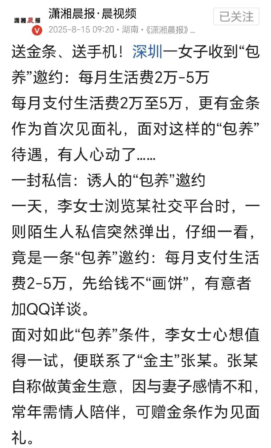 深圳,一女子浏览社交网站,突然弹出一条包养邀约: 每月支付生活费2-5万,先给钱不画饼,有意者详谈,女子立刻和对方联系,对方告诉她说,和妻子不合,常年需要情人陪伴,会送手机和金条,女子心动,预定了酒店,刚一见面,男子就给她一根金条,俩人发生了关系,事后,男子要她买两瓶五粮液,可以帮她把金条变现,女子买下之后,第二天联系男子,发现已被拉黑,女子报警,真相令她目瞪口呆! 2025年8月15日,据潇湘晨报·晨视频报道,一女子因为贪心,被网友骗了。 李女士做梦都想发财,可普通工作,最多也就三四千块。 李女士无聊至极,随手打开了社交网站,她平时上班,信息闭 塞,认识的男子非常有限。 她渴望出现一位男子,能救她于水火,给她想要的生活,让她不用再去上班。 李女士的理想,非常的丰满,可是她的圈子,根本遇不见她想要的男子。 她在社交网站上浏览信息,突然弹出一条陌生人发来的私 信。 李女士仔细一看,这条私 信是一条“包养”邀约:每月支付生活费2~5万,先给钱不画饼,有意者+Q详谈。 女子半信半疑,还有这等好事?她抱着试一试的态度,和金主张某聊了起来。 张某告诉她说,生活中和妻子不合,生活苦闷,常年需要情 人陪伴。 张某还说,如果李女士愿意和他见面,他会送李女士一根金条做见面礼,还会送给她一部手机。 李女士半信半疑,张某给她发来购物截图,直接给她拍了一部平 果手机。 李女士见对方如此出手大方,她心动了,看来张某是真心诚意,这样的贵人,绝不能错过。 李女士答应见面,立刻预定了酒店,到了见面的时间,李女士装扮了一番,她要以最佳状态,吸引对方的注意。 不大一会,张某到了,一见面就拿出一根金条,直接摆在了李女士面前。 金条金晃晃的,发出耀眼的光彩,李女士瞳孔亮了,从未见过如此阔绰的男子。 李女士想起那部平果手机,再看看这一根沉甸甸的黄金,她心动不止,拿起金条放进了包里。 她放下戒备,已经对男子没了怀疑,她半推半就,和男子发生了关系。 事后,男子告诉她说,由于金条比较特殊,并不方便在市场里兑现。 但是,他有一位朋友,是开金店的,如果李女士想把金条变现,可以找他朋友帮助。 李女士她不假思索,点头答应,张某话锋一转,向她提出一个条件。 他说要朋友帮忙变现,很是麻烦,需要给朋友买两瓶五粮液,作为回礼,这样他才好意思开口求助。 李女士不假思索,立刻下单买了两瓶五粮液,交给张某,要他去找朋友帮助。 谁知到了第二天,李女士想问事情的进展,她拨打张某电话,这才发现,张某已经拉黑了她。 李女士急忙拿着金条去做了鉴定,果不其然,金条是假的,那一张买手机的截图,也是用软 件P出来的。 李女士这才知道,自己被张某骗了,什么都是假的,唯独自己买的五粮液才是真的。 李女士立刻报警,警方顺藤摸瓜,很快就将张某抓获。 原来,张某是个骗子,在社交网站上大面积撒网,2个月内,有7位女子被他骗了财物,骗了身子。 张某没有想到,自己这种行径,这么快就被发现,他曾经沾沾自喜,觉得自己把这些女子骗得团团转。 他看着骗来的财物,暗自嘲笑,这些女人是如此的贪婪。 真相虽然残酷,但确实如此,如果没有贪小便宜,谁也骗不了你,天上掉的不是馅饼,而是陷阱。 有人说了,这么有钱的男人还需要来找网友做情 人吗?这女子见利智昏,也是活该,希望她能记住教训! 张某被抓获后,底下脑袋,他认罪认罚,为了避免更大的惩罚,积极配合给受害人退还赃 物。 张某被提起了公诉,最终受到了法律的制裁。 那么,这件事在法律上是怎么认定的呢? 《刑法》第266条规定:诈骗公私财物,数额较大的,处三年以下有期徒刑、拘役或者管制,并处或者单处罚金; 数额巨大或者有其他严重情节的,处三年以上十年以下有期徒刑,并处罚金; 数额特别巨大或者有其他特别严重情节的,处十年以上有期徒刑或者无期徒刑,并处罚金或者没收财产。 张某通过虚构“包养”事实,以虚假承诺,支付高额生活费、赠送金条和手机骗取李女士信任。 张某进而要求李女士购买五粮液,并和张女士发生了关系,最终非法占有了财物。 因此,张某的行为构成诈骗罪,且属于多次诈骗,应依法从重处罚。 《刑事诉讼法》第15条规定:犯罪嫌疑人、被告人自愿如实供述自己的罪行,承认指控的犯罪事实,愿意接受处罚的,可以依法从宽处理。 张某被抓获后认罪认罚,并积极退还赃物,符合从宽处理的条件。 张某的认罪认罚和退赃行为可作为量刑时从宽处理的依据。 李女士因贪图利益轻信张某的承诺,存在一定过失,但法律上诈骗罪的成立不要求受害者无过错。 只要行为人实施了虚构事实、隐瞒真相的诈骗行为,即可构成犯罪。 最终,张某受到了法律的制裁。 对此,你怎么看?欢迎评论区留言讨论。 关注@王哥说法 学法律知识。#头号创作者激励计划#