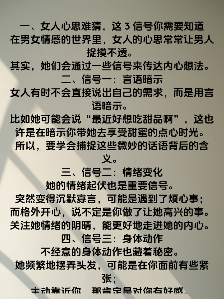 一、女人心思难猜,这3信号你需要知道\n在男女情感的世界里,女人的心思常常让男人捉摸不透。其实,她们会通过一些信号来传达内心想法。\n二、信号一:言语暗示\n女人有时不会直接说出自己的需求,而是用言语暗示。比如她可能会说“最近好想吃甜品啊”,这也许是在暗示你带她去享受甜蜜的点心时光。所以,要学会捕捉这些微妙的话语背后的含义。\n三、信号二:情绪变化\n她的情绪起伏也是重要信号。突然变得沉默寡言,可能是遇到了烦心事;而格外开心,说不定是你做了让她高兴的事。关注她情绪的阴晴,能更好地走进她的内心。\n四、信号三:身体动作\n不经意的身体动作也藏着秘密。她频繁地摆弄头发,可能是在你面前有些紧张;主动靠近你,那肯定是对你有好感。多留意这些细节,就能慢慢读懂女人心。