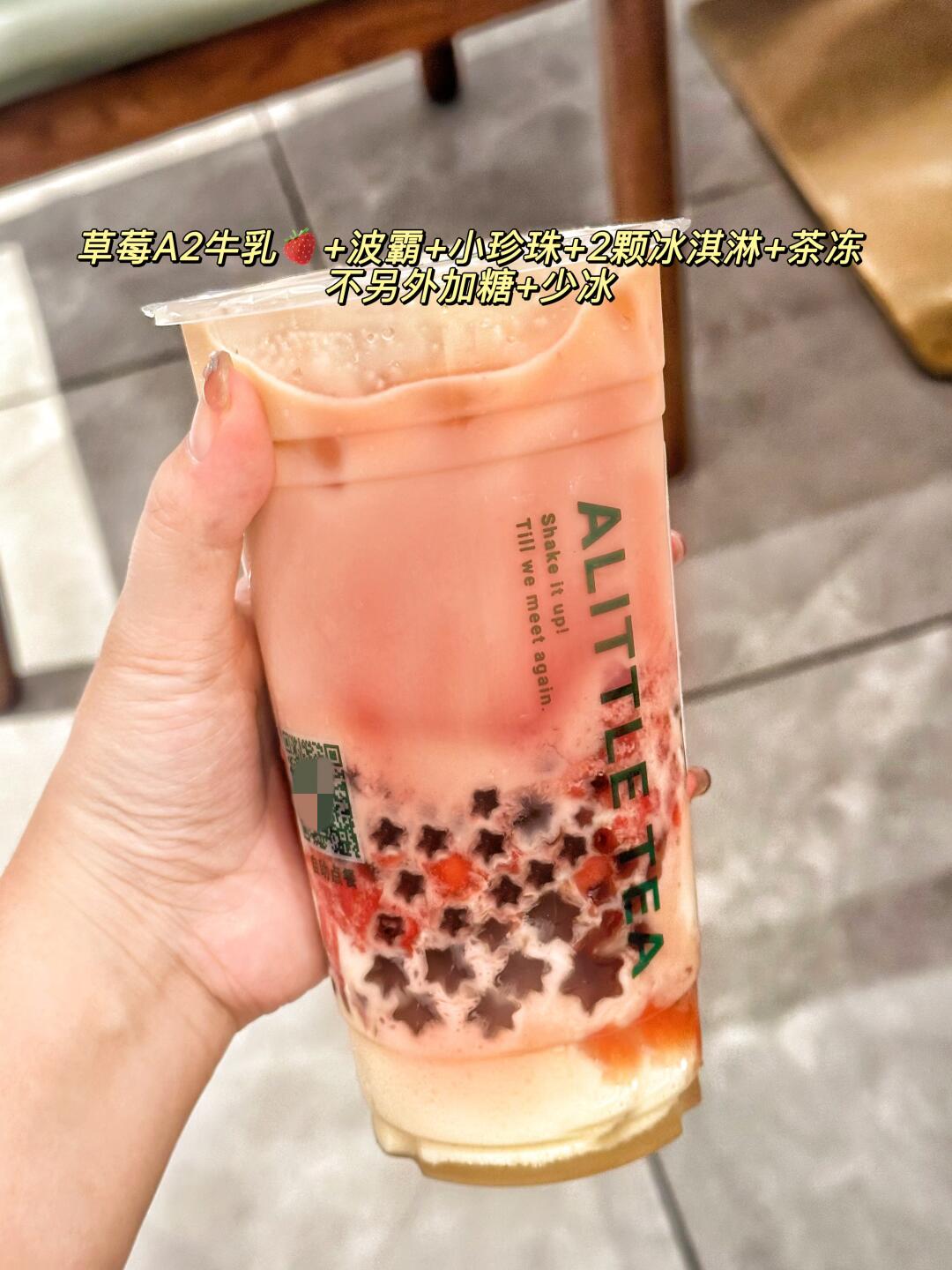 ✔️草莓A2牛乳+波霸+小珍珠+茶冻+2颗冰淇淋 ✔️不另外加糖,少冰,一点点小料任加属实爱了!哈哈哈等于奶茶粥和奶茶一起喝了!好好喝