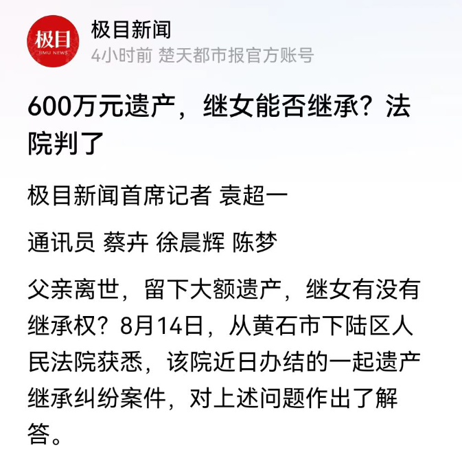 【信源】《600万元遗产,继女能否继承?法院判了》,2025-08-15 08:32·极目新闻