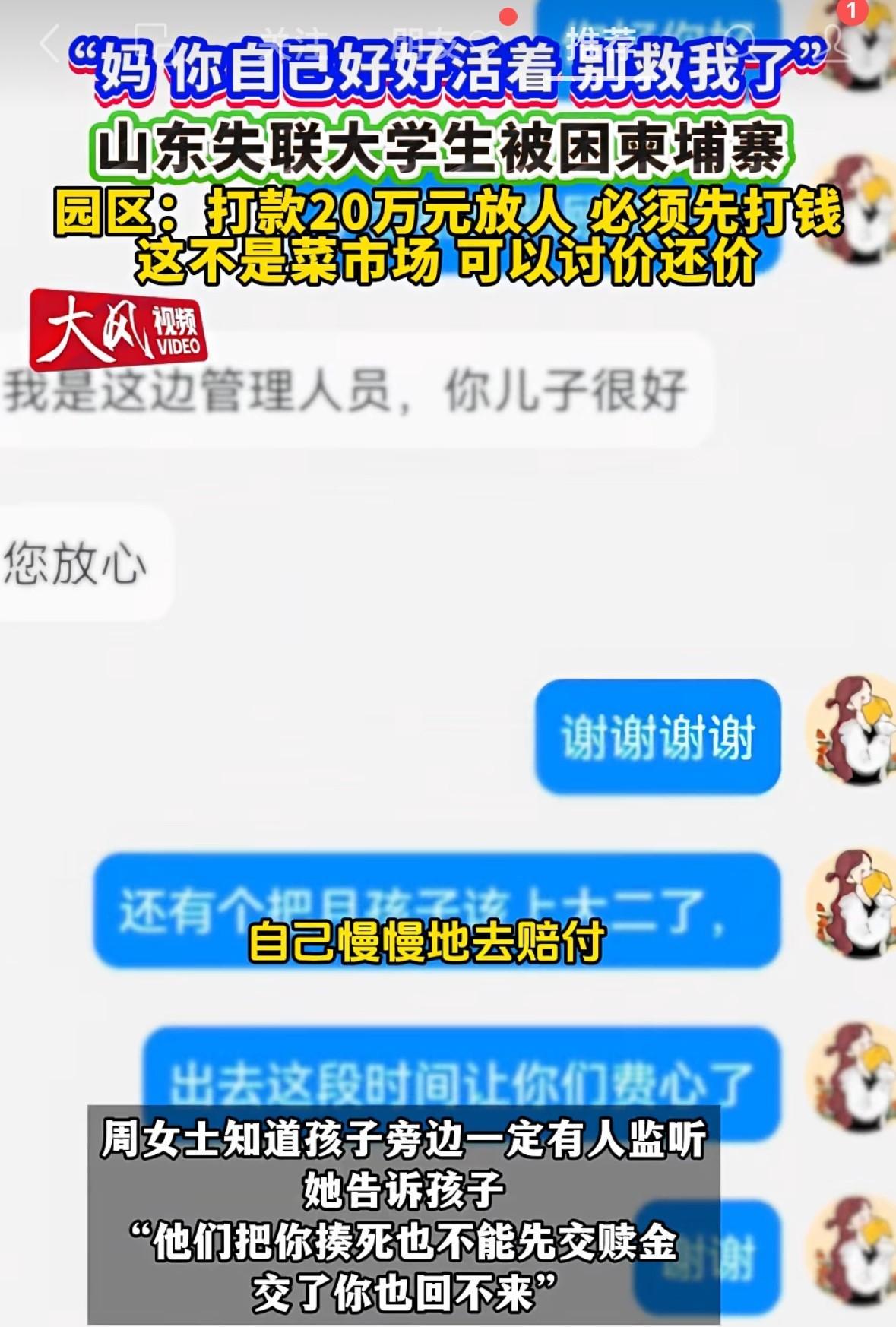 山东被困缅甸大学生,跟妈妈一分钟视频曝光。孩子妈妈说“钱我准备好了,就算我给他们,他们把你揍死了,也不会放人”。 视频中孩子说“妈,我求你了,咱不用说那么多,不用替我赔付了,你把钱都还回去,你好好生活,我在这边慢慢赔付”,他妈说“你说孩儿,妈妈看不到你能放心么,我准备好钱了,你也回不来”。 估计孩子妈有很多顾虑,可能怕给了钱,孩子也回不来。那也应该试一试呀,不能这样硬拖,孩子活着最重要。 真替他们着急,都这个时候了,还磨磨唧唧的,唉,真可怜呀。 这个孩子也许就是想出去多赚点钱,替家里分担点经济压力吧!#爆料#