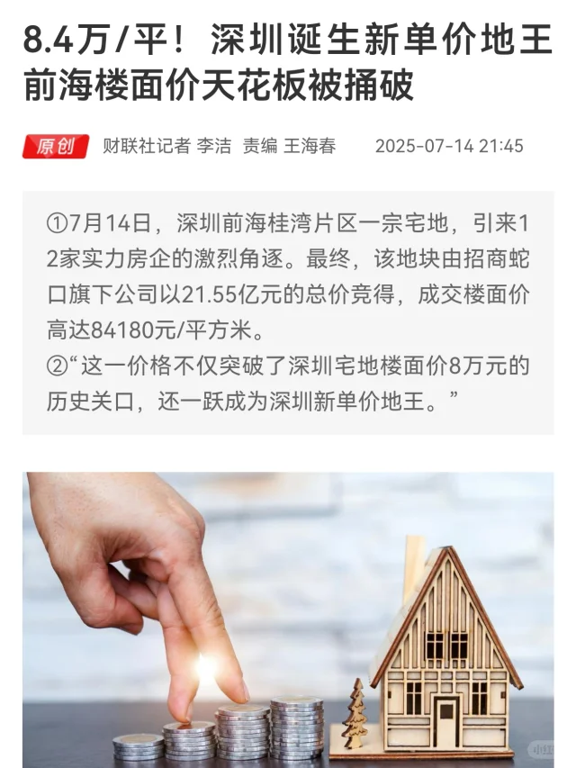 7月14日(昨天),深圳土地市场迎来重磅交易,位于前海核心桂湾片区一宗宅地,引来12家实力房企角逐。最终,招商蛇口旗下公司以21.55亿元的总价竞得,成交楼面价高达84180元/平方米。这一价格不仅突破了深圳宅地楼面价8万元的历史关口,还一跃成为深圳新单价地王。
