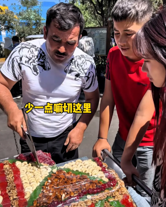 就是这种切糕的坏了整个新疆小商贩的招牌~以前厦门也很多,标价写70,等结账时说是一两70,不给钱就围过来一堆一堆的戴新疆帽的,腰间还配匕首。久了名声大噪连带卖新疆其他特产的,那些红枣核桃哈密瓜[捂脸哭]没人再敢问津,好几年没看到戴新疆帽的小商贩了[滑稽笑]
