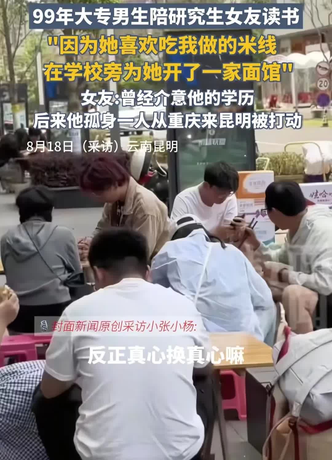 云南昆明,一大专男生为了方便陪伴女友读研究生,于是在女友学校旁边开了一家面馆,因为女友爱吃他做的米线,女友:曾经介意他的学历,但是看到他一个人跑这么远来陪我,被打动了 男子为了女友孤身一人从重庆跑到昆明,默默坚持,从无到有,男子凭着一腔热血,说着真心换真心的朴实话语,实在令人感动 女孩在学校里面认真读书,男孩在学校外面认真工作,不忙的时候女孩就来面馆给男孩帮忙,俩人就像是患难与共的战友一样,你陪我读书,我陪你创业,谁也不依靠谁,等到时机成熟就组建一个共同的小家庭 这好像是小说里面才有的画面,没想到现实中真的有人可以做到,委实羡慕了 有人说别看现在很幸福,谁知道会不会是上岸第一剑先斩意中人 我觉得以后的事情以后再考虑,过好当下才是最好的,而且虽然男子学历低,但是他开的面馆生意这么火,以后当个大老板也未可知,女孩有着高学历,以后工作肯定不愁,妥妥的郎才女貌,门当户对 不管是谈恋爱或是结婚,双方实力相当才能走得更远,如果一方非常优秀,另一方不求上进,不思进取,结局肯定是分道扬镳,反而是两方都努力上进,齐头并进,最后才能收获幸福,祝愿俩人未来长长久久