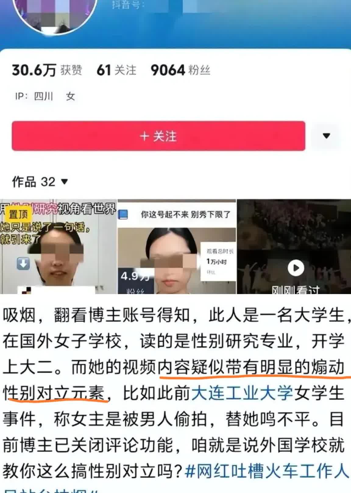 果然被我猜中了! 此女举报别人抽烟目的不纯 身份被网友扒出,是国外女子学校大二生,学的是性别研究专业。 她的社交账号里,之前还发过投诉“男童禁入女厕”标语的视频,疑似每条内容都带有挑起性别对立的元素。 这次举报别人抽烟也不是关心健康问题,而是制造话题,挑起网络舆论。 抓住公共场合抽烟的关键点,挑起烟民和拒吸二手烟的人的对立,讨论越激烈,为她引来的流量越大。 这不妥妥的恶意起号么?听说已经开始直播卖货了,真不知道什么人会下单。