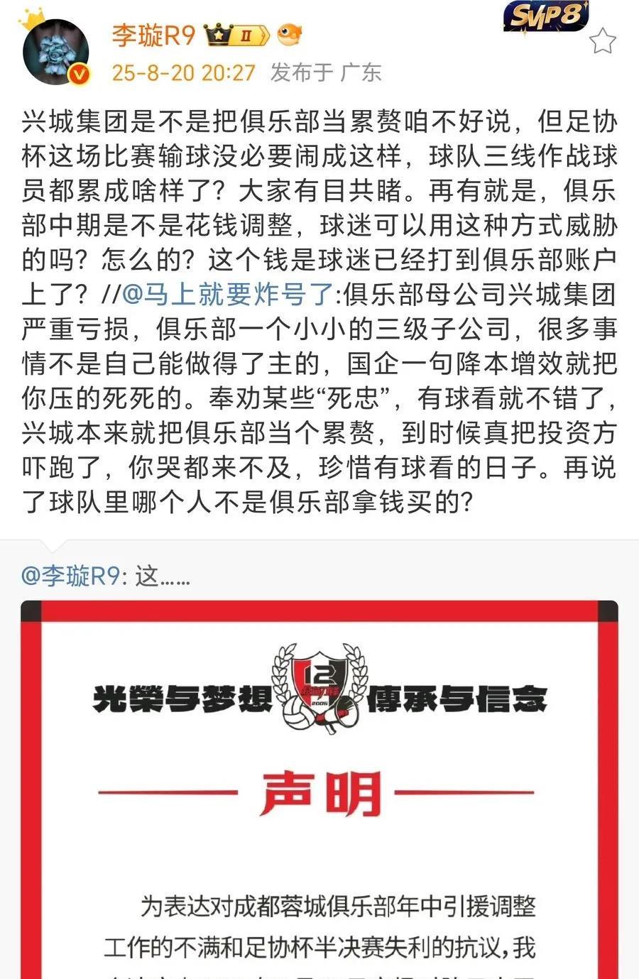 知名媒体人怒批成都红色刀锋球迷会! 成都刀锋球迷会在成都蓉城足协杯出局后,发表声明,大意就是无声抗议俱乐部中期不调整,不买人。随后引来热议。 知名足球媒体人李璇社媒称,三线作战都这样了,还想怎么,球员都累成啥样了。李璇还表示,这个钱是球迷已经打到俱乐部账上了吗! 确实,蓉城现在的成绩,已经相当不错了,三线作战,都想要成绩,中超没有任何一支球队能够做到!蓉城俱乐部就应该早给球迷降温,早做出舍弃!#成都蓉城# #成都刀锋球迷会# #中超#
