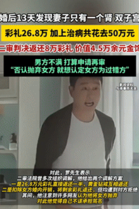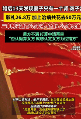 这就是婚检的重要性!江西南昌,一男子花26.8万娶了个媳妇,可婚后没几天,就发现了问题,妻子不仅只有1个肾,还有两个子宫,给她看病又搭进去几十万,甚至后来妻子还不愿和他生活,无奈之下,男子只好将妻子告上法庭,索要彩礼! 据每日热搜8月19日的报道,当初两人在结婚的时候,并没有做婚检,所以对于女方的病况,男子是一点都不知道。 直到婚后半个月左右,女方的身体出现异常,最开始她还不肯去医院检查,但男子坚持带她就医,这才得知了一切。 不过就算是这样,男子也没说撒手跑路,反而是拿钱积极给她看病,垫进去了不少钱,给自己家都弄困难了。 可他所做的一切,却没有打动女方,到后面就不想和他过下去了,无奈之下,男子只好到法院起诉离婚,并让女方把给的彩礼等还回来。 而法院在了解完情况后,就宣判让女方归还4万元外加钻戒,对于这个结果,男子肯定是没办法接受的,于是选择了上诉。 如今二审的结果也出来了,女方需要返还8万外加五金等,要是五金还不了的话,那么要按照当初买的钱,也就是将近4万6来给。 但是对于这种结果,他还是接受不了,要不就归还50%的彩礼,要不就计算好女方婚内开销,然后从彩礼中扣掉,把剩下的给还回来。 不过这却轮到女方不愿意了,如今的话,男子就准备再次发起诉讼。